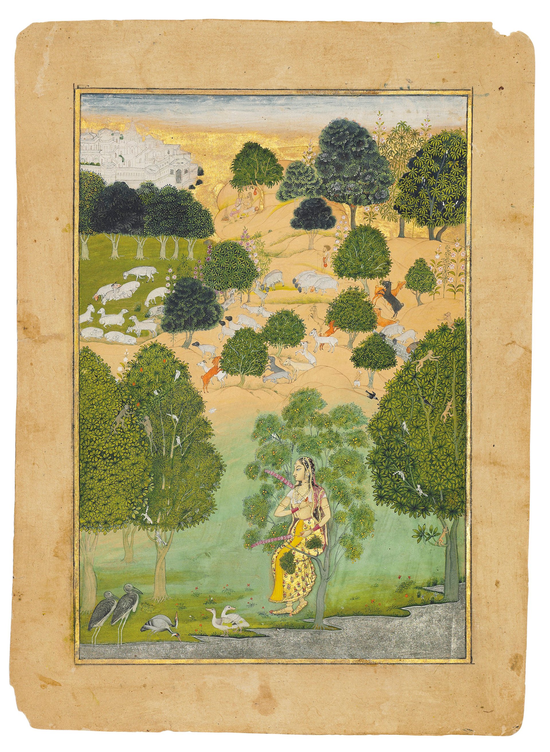 This finely painted Rajasthani miniature is a highlight of the 29-piece Moscatelli collection of Ragamala paintings. Ragamala paintings—in which a series of ragas, a set of musical modes originating in medieval India, are given a visual representation—flourished from the late 15th century onwards. The works often explore the relationship between lover and beloved, and by extension between the human and the divine. The essence and emotion of the Gauri Ragini—an evening raga assigned to autumn, or to melancholic or contemplative moods—is captured in this work, where a female character, who is lingering for her beloved by a river, is shown on the foreground of an extensive landscape filled with animals and birds, which visually heightens her solitude. The high finish of the work and use of light pastel colours reveal the influence of Bikaner court painting, as well as that of both Mughal and Deccani court painting. This combination has produced a particularly elegant and delicate rendering of Gauri Ragini, which must once have been part of a series comprising at least 36 equally exquisite paintings.—Henrietta Cockrell