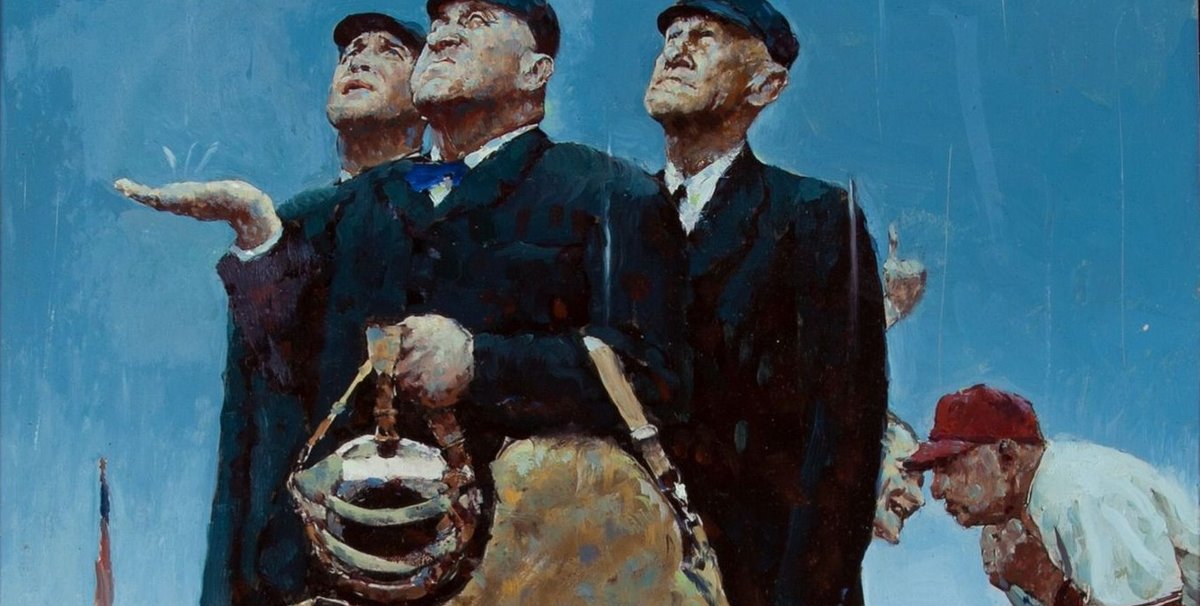 19-20 August: Platinum Night Sports Collectibles Study for Tough Call, Saturday Evening Post (1948) by Norman Rockwell