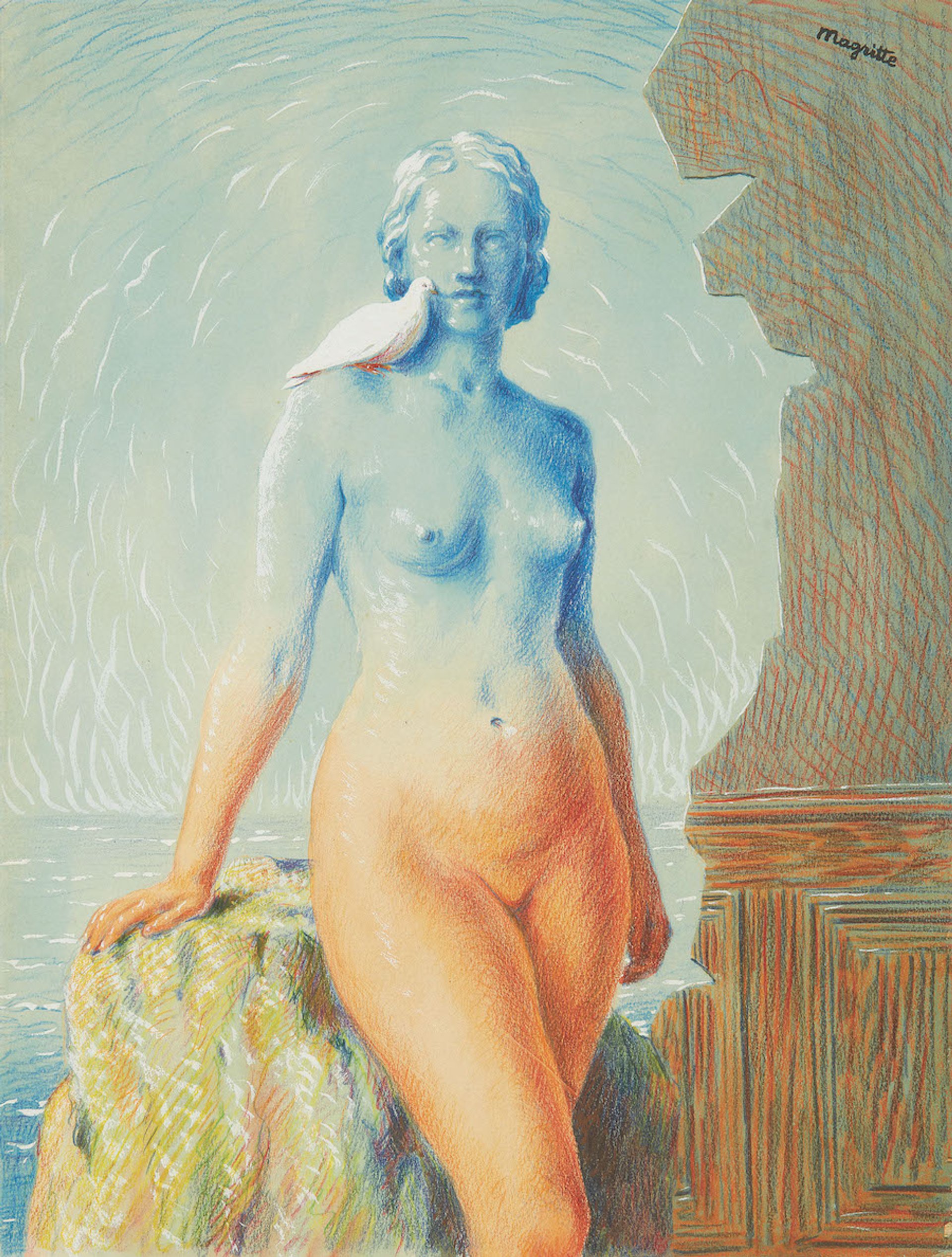 Magritte once claimed “it is an act of black magic to turn woman’s flesh into sky”, and his La Magie Noire (black magic) works, started in 1934, feature one of his most recognisable motifs of metamorphosis—a nude female figure, set against an idyllic landscape, dissolving into translucency to reveal the blue sky behind her. In 2017, an oil painting of the same name from 1942 exceeded its high estimate, selling for £1.6m at Christie’s in London. This related gouache and watercolour version, on the market for the first time, is priced comparatively conservatively.—Margaret Carrigan