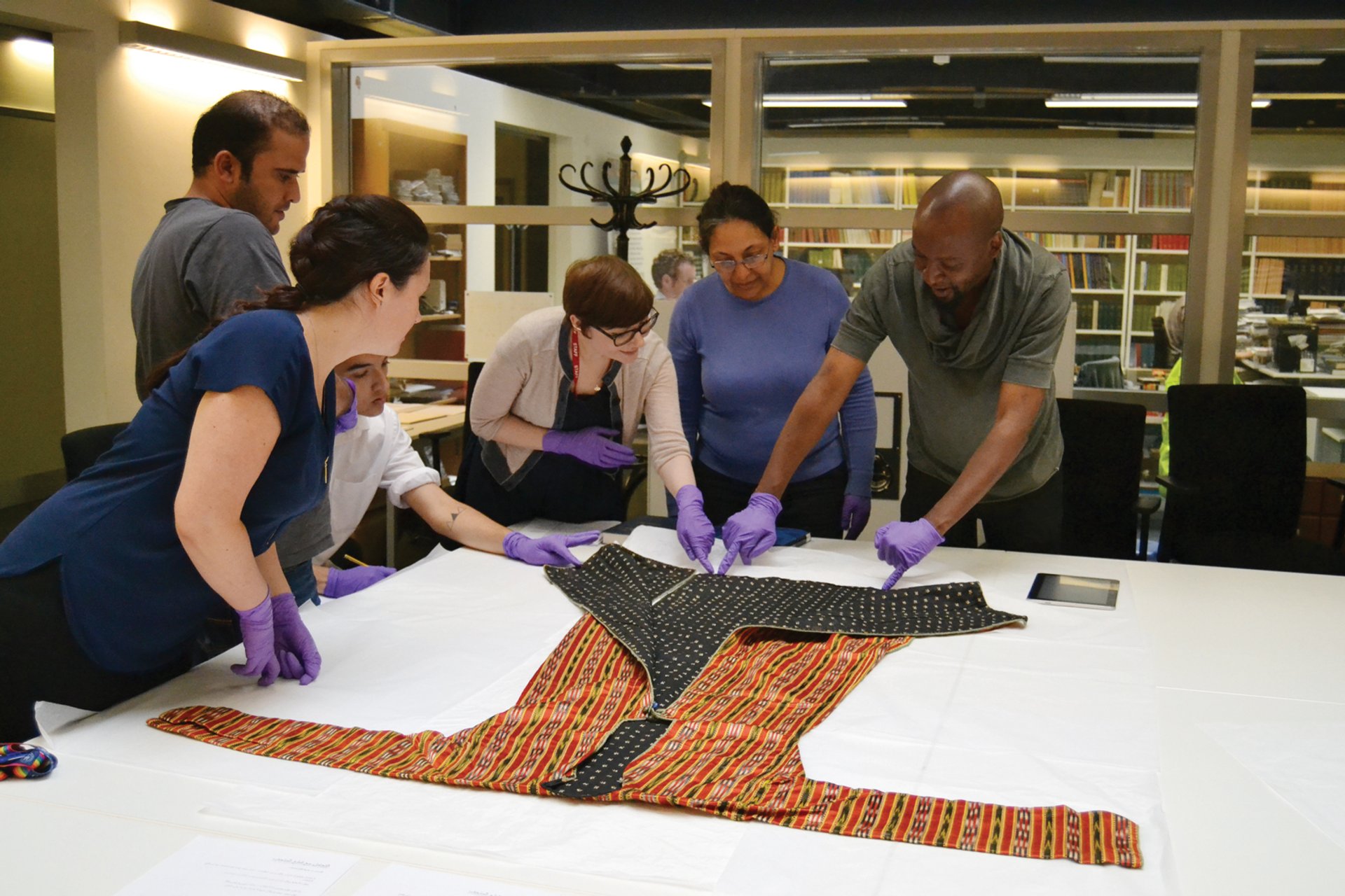Collections officer Abigael Flack shows volunteers in Oxford a textile from Syria Tammam Aboukerech