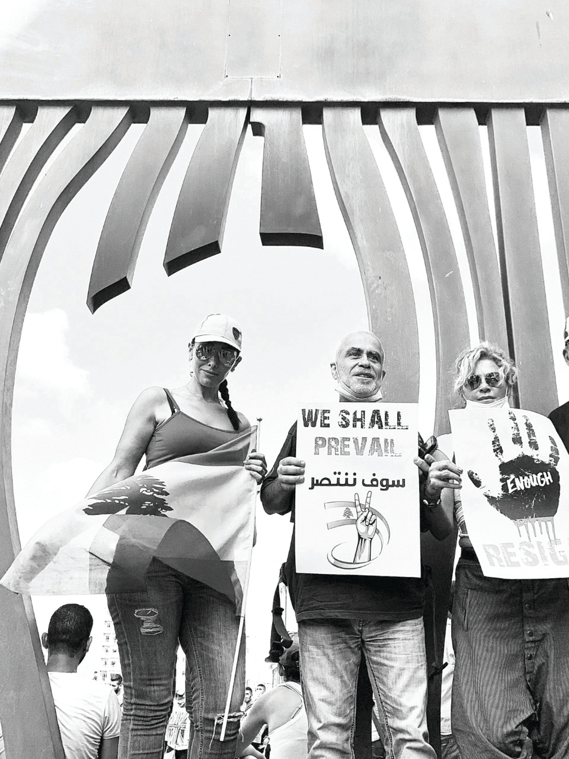 Beirut residents in front of Hady Sy’s sculpture The Wall of Hope (2019). The area in which it stands was badly damaged, but the sculpture remained intact © Hady Sy
