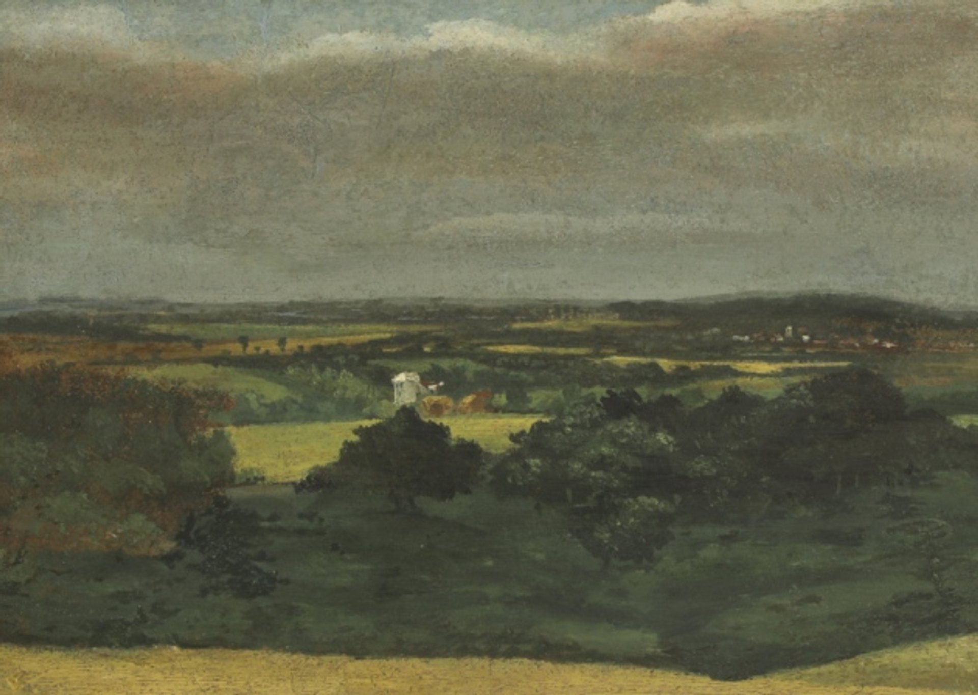 A weatherboarded windmill is visible in the middle distance of the work. Charting the depicted landscape on an ordinance survey map, it can be identified as Brantham mill, which was owned by Constable's father, the wealthy corn merchant Golding Constable.