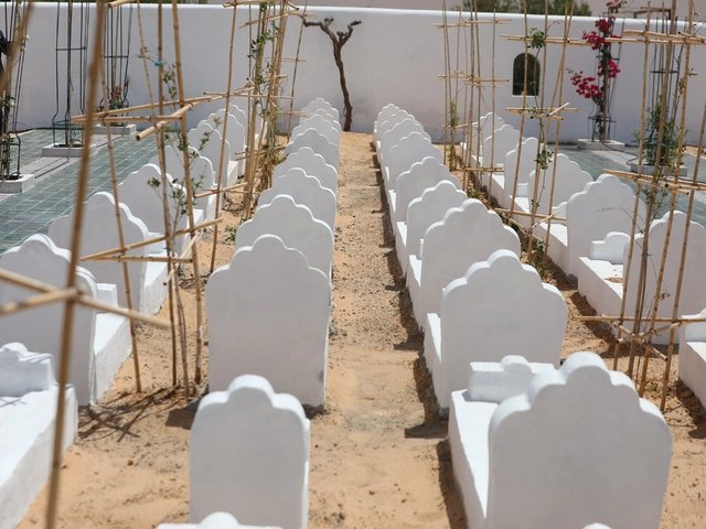 Though Koraichi intends to have Jardin Afrique opened for next spring, he unexpectedly found himself having to bury 56 anonymous bodies last month in a temporary trench-like grave, where each body is separated by bricks, after the Tunisian Red Crescent (a humanitarian organisation affiliated with the Red Cross) brought the corpses over. This occurred after 90 migrants, including a baby and a heavily pregnant women, drowned in early July this year. Local authorities have become overwhelmed by these tragedies and an existing cemetery was reportedly full. “The Red Crescent didn't know where to take the bodies, so they brought some of them here,” Koraichi says, adding that one Libyan and several Bangladeshis were among the dead. “When we've finished the cemetery, we'll move them to proper graves.”