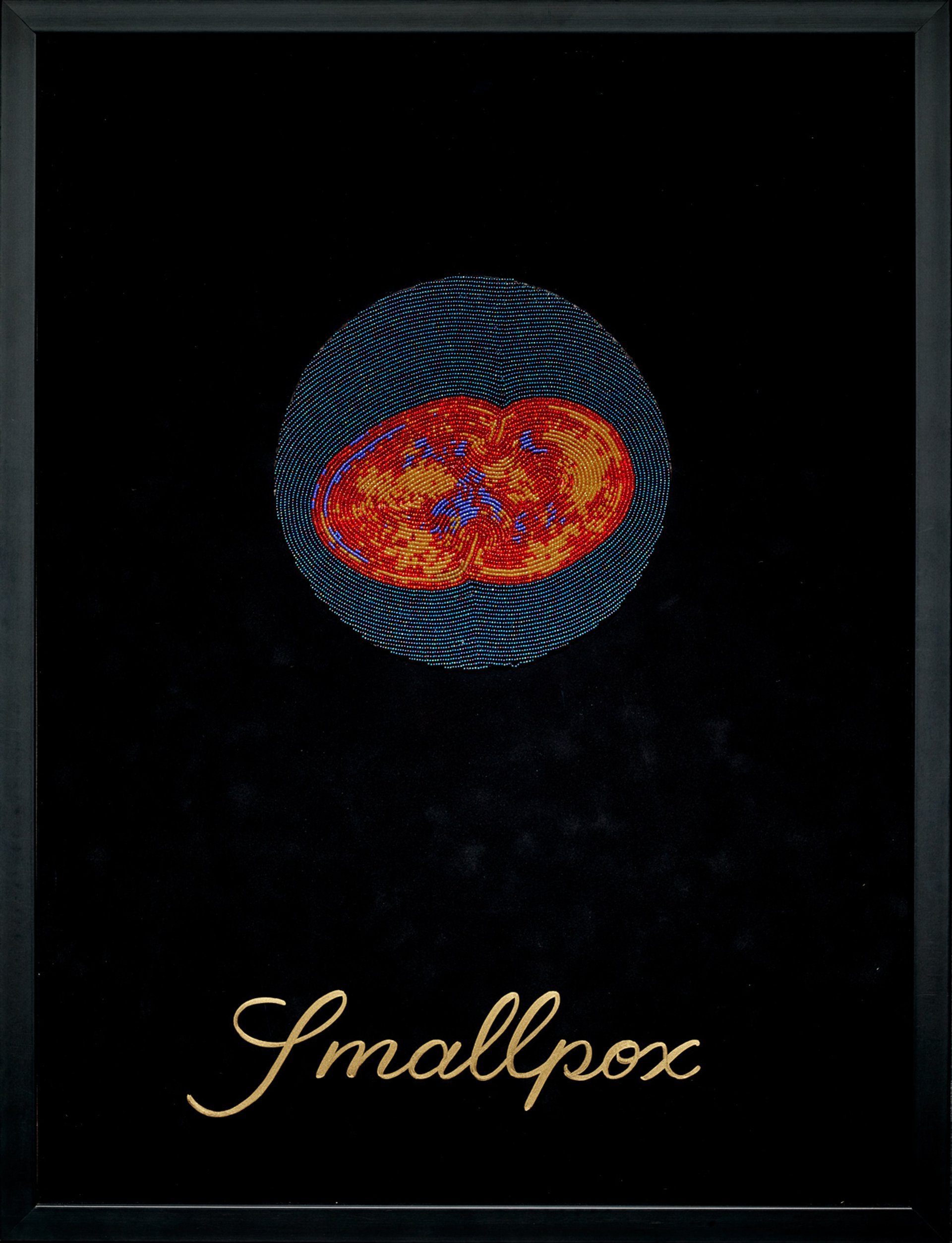 Ruth Cuthand, Smallpox (2011), glass beads, acid free matboard with rayon flocking, nylon and polycotton thread, oil paint, Plexiglas and wood frame © Ruth Cuthand. Photo: National Gallery of Canada, Ottawa