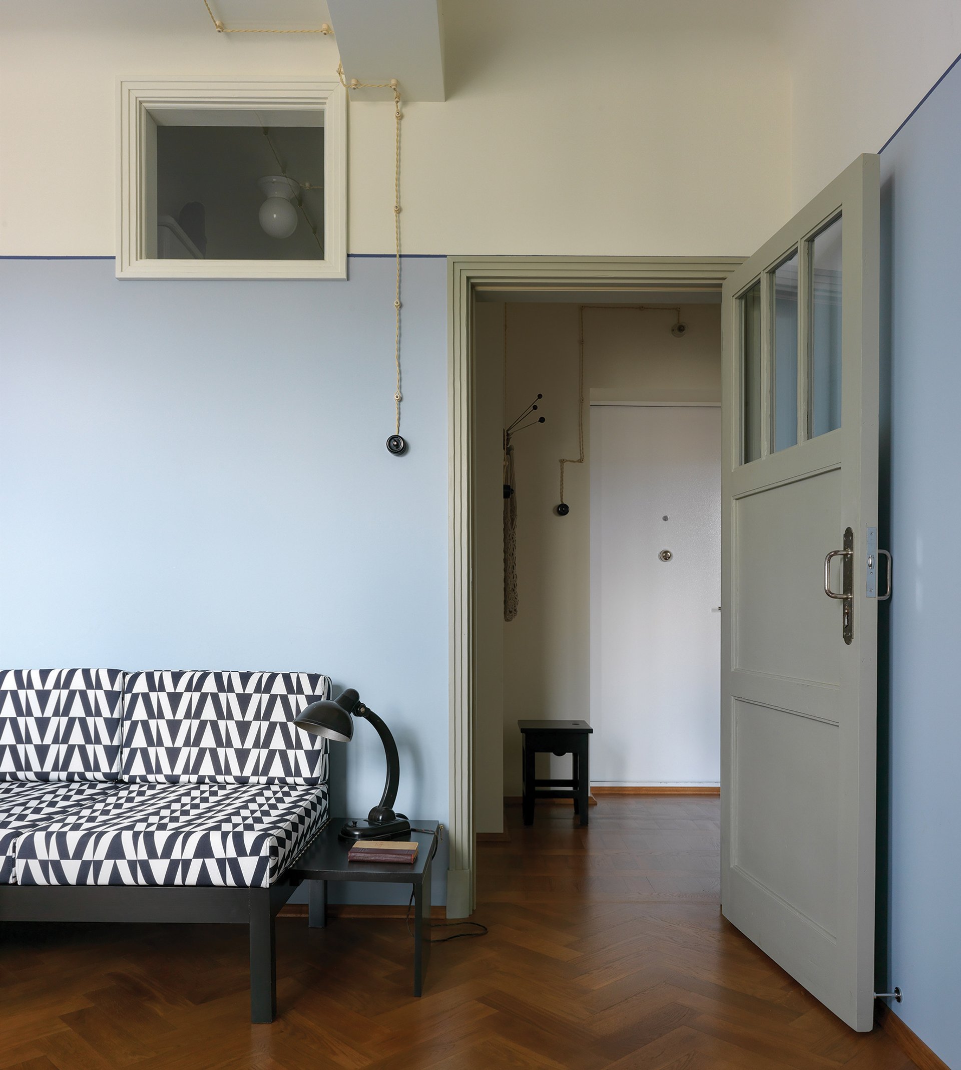 Dudnev and Gudkov brought in fresco restorers; worked with the interior designer Mariya Pilipenko; and commissioned Less design studio to recreate avant-garde furniture for the flat, including Nikolai Suetin’s famous Suprematist chair and table set as well as other designs they discovered in archives. The sofa is upholstered with a fabric made from a design by the Russian artist Lyubov Popova.