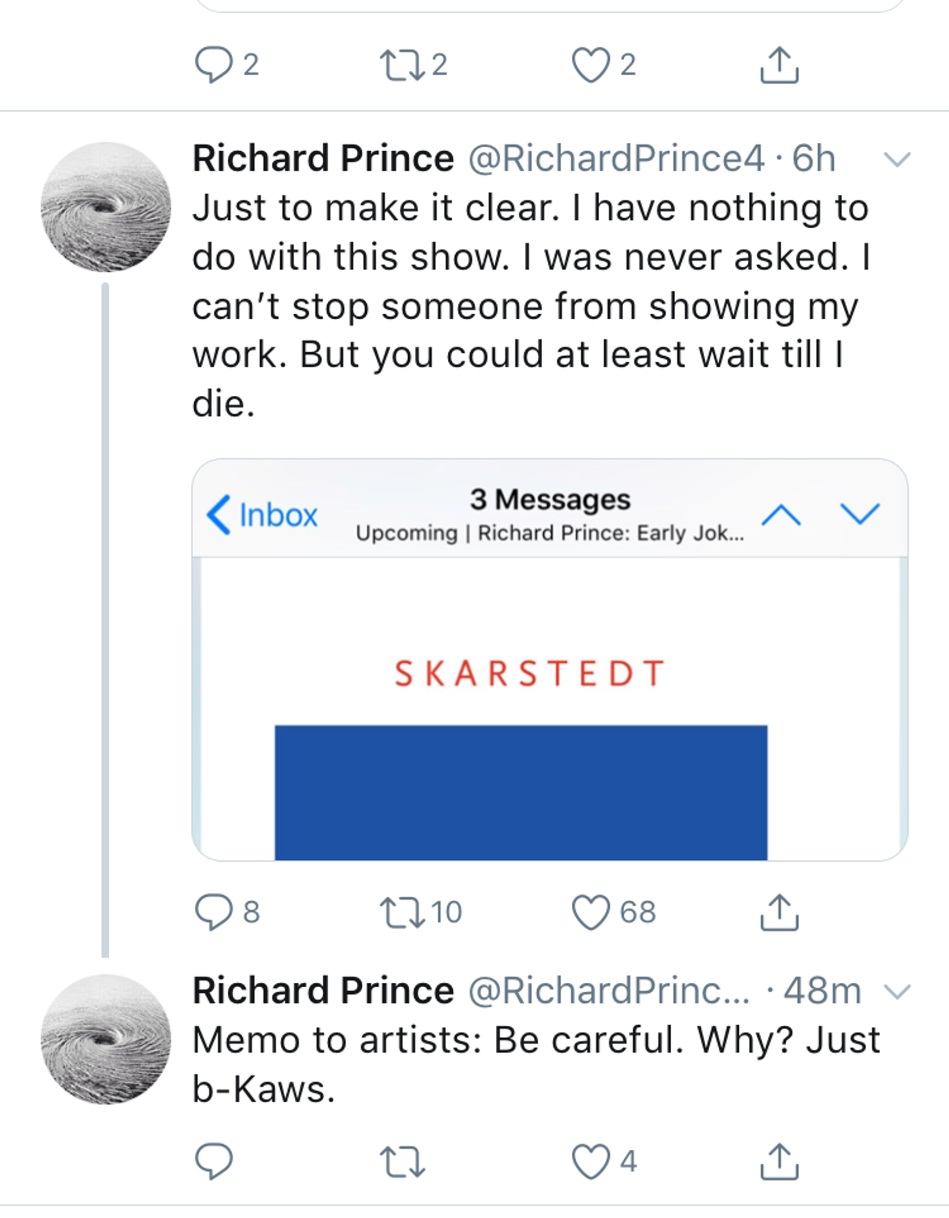 Richard Prince's tweets about the Skarstedt show @RichardPrince4/Twitter