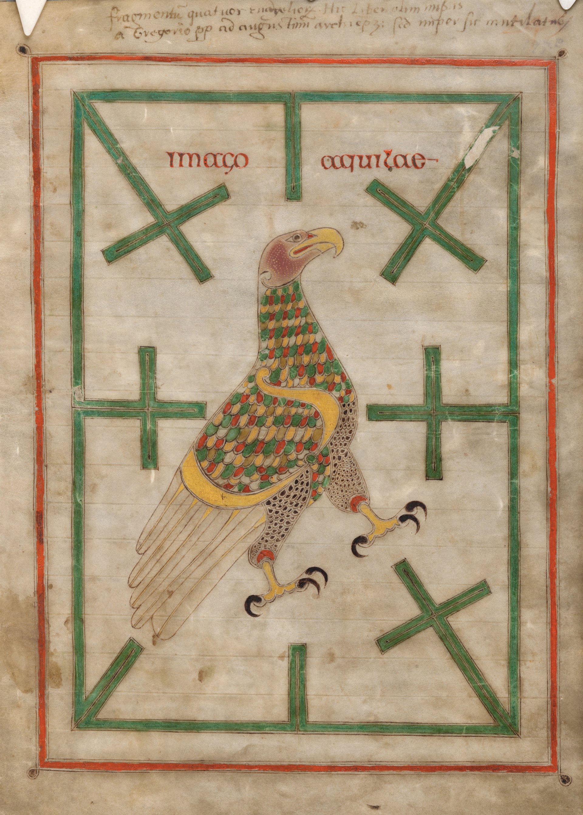 The Fitzwilliam show reinforces how much science informed artists at the time. A fascinating example is a page showing St John’s Eagle (Northumbria, early eighth century), from the collection of Corpus Christi College, Cambridge, and one of a handful of significant loans to the exhibition. Here, the painter shows an absolute understanding of his corrosive materials—including lead and copper. Carefully isolated buffer zones, made with untouched canvas and ink, protect the colours from flaking or blackening.