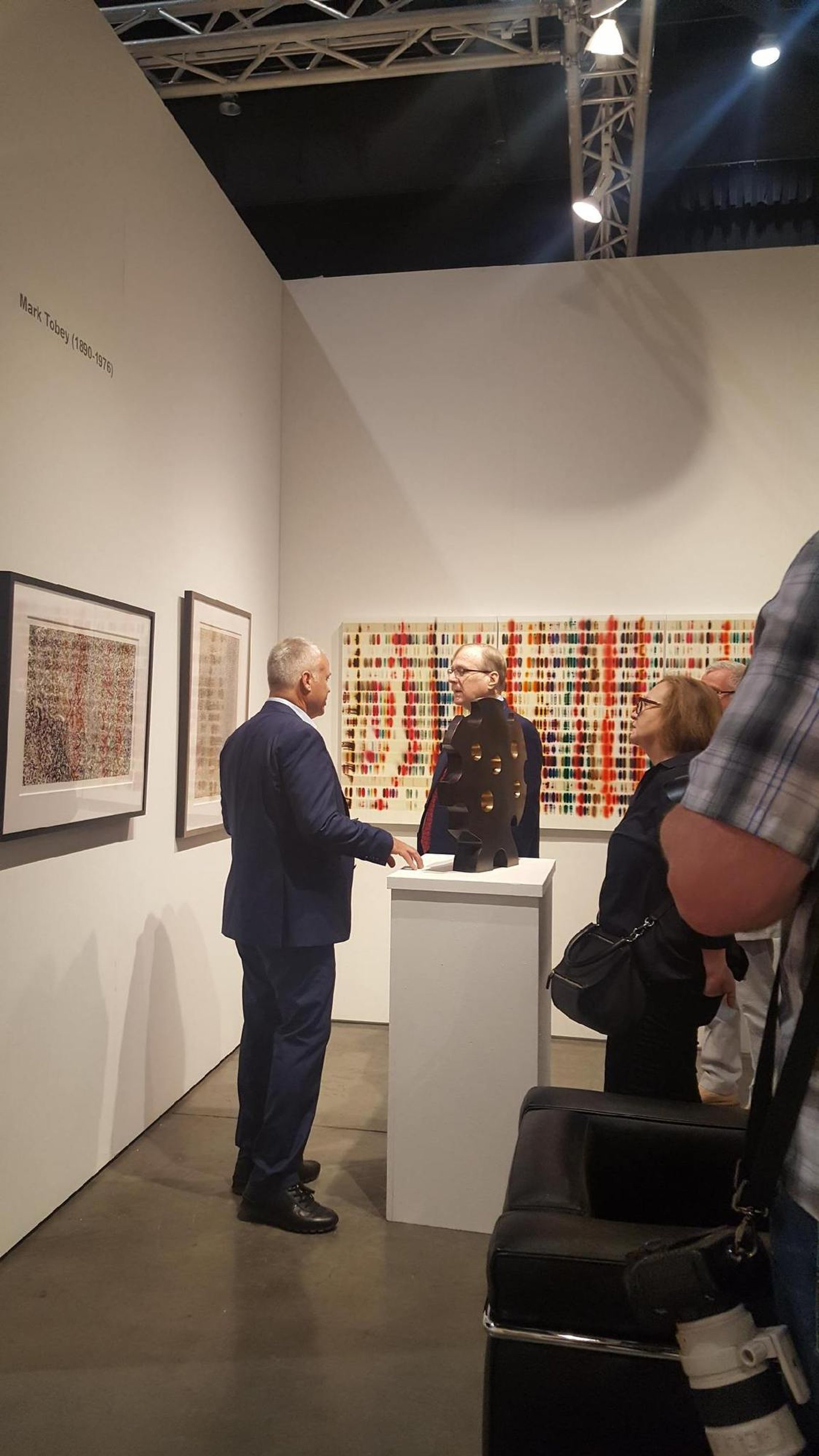 Roberts & Tilton, in its second year, reported a “very successful” opening day, with several pieces on reserve for institutions, including a 1970s Betye Saar wall hanging adorned with hanks of hair that the artist had recently discovered hidden away under her couch (asking $160,000). “It’s very different from last year”, says the gallery’s Julie Roberts. “It’s better.” Speaking with Los Angeles colleagues, Bennett Roberts reported that the mood is “positive”, and “they’re selling a lot of their less expensive pieces”.