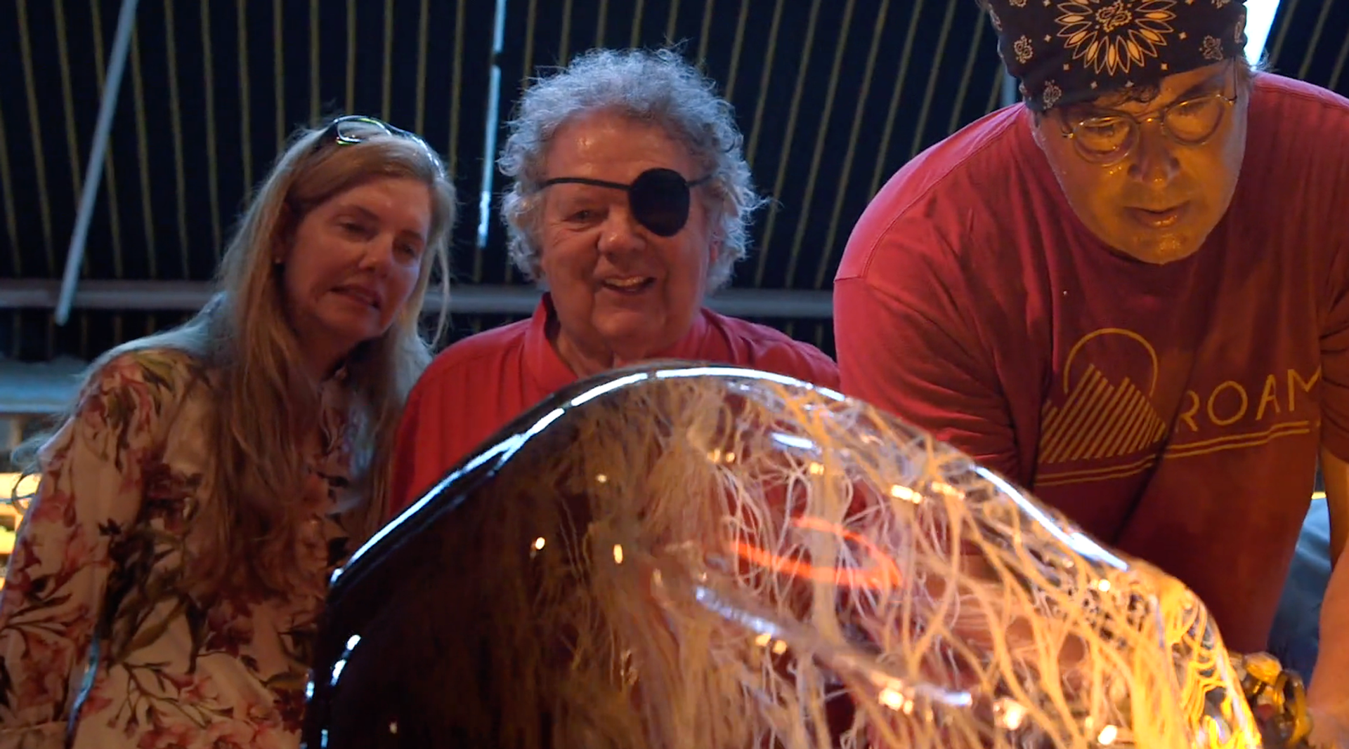 Still from a behind-the-scenes video of Chihuly working on his newest "merletto" collection in his Seattle studio. Pictured from left: the artist's wife Leslie Chihuly, Dale Chihuly and the glass artist James Mongrain. © Chihuly Studio. All Rights Reserved