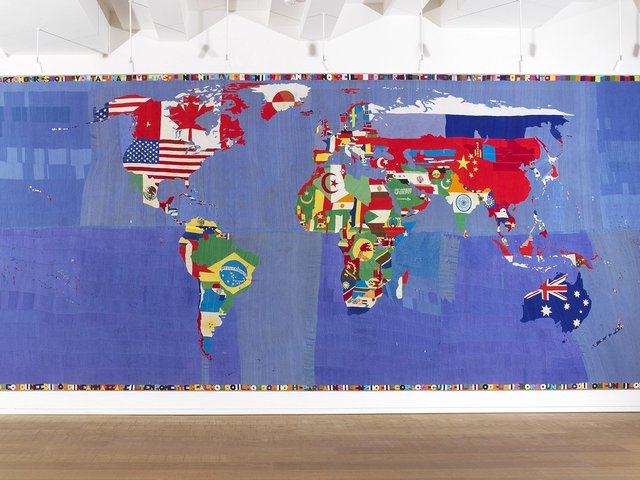 The show, organised in collaboration with the Archivio Alighiero Boetti in Rome and the London and Paris-based Tornabuoni gallery, brings together the largest and smallest examples from Boetti’s most famous series, dating from 1967 to 1994: his Ricami (embroideries), Aerei (planes), Mappa (map), Tutto (everything; his final series of embroidered works) and Biro (works made with a ballpoint pen). There are 11 sections in this non-selling show, with two works on view in each.