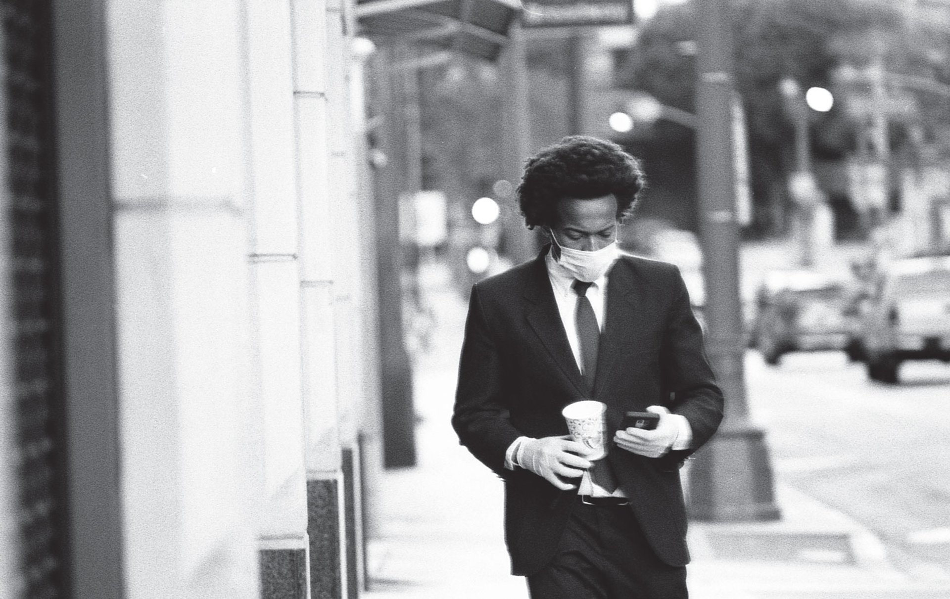 A man in gloves and face mask checks his phone in Orson Oblowitz's photo On the Go, Los Angeles, CA Orson Oblowitz, Courtesy of the National Museum of American History