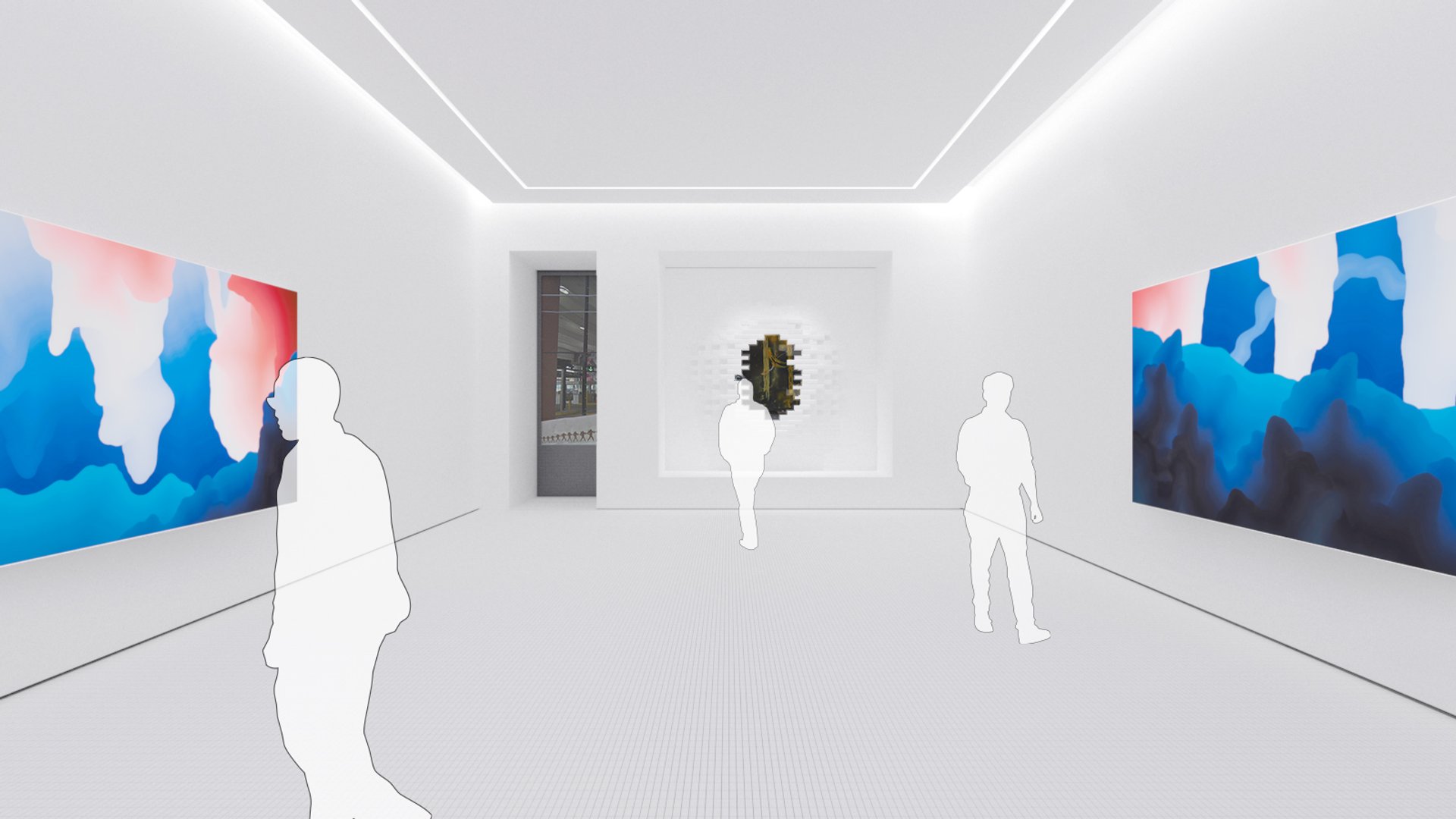 A rendering shows the view inside towards the front of gallery © Snarkitecture