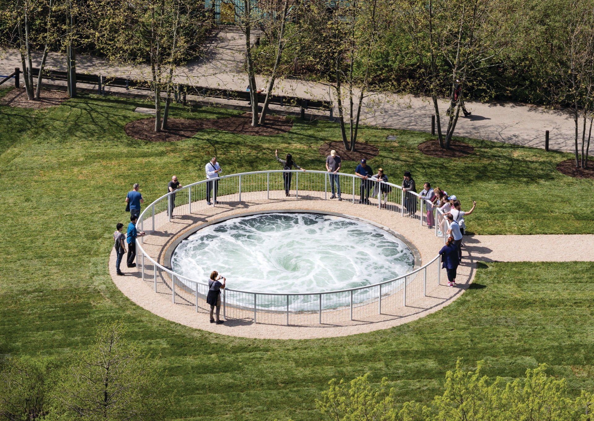 Kapoor: jump, Trump! “Public art does have a very important role to help us see that public space matters; that public space is communal; that it doesn’t belong just to the rich,” Anish Kapoor told us on Wednesday, shortly after the opening of his installation Descension (2014), in Brooklyn Bridge Park. The work—a swirling, rumbling vortex of water that resembles a giant hot tub—is ringed by a railing for public safety. But Kapoor is unconcerned about the safety of one native New Yorker who is back in his hometown this week: the 45th president. “As far as Trump goes,” he said, “I wish he’d jump in there.”