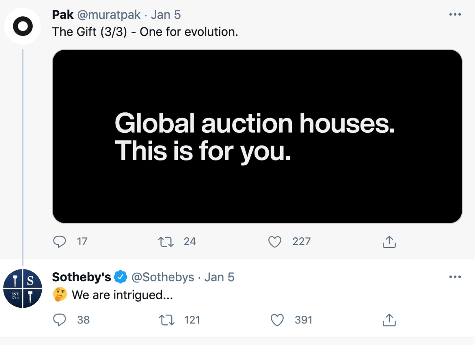 This is not the first time Sotheby’s and Pak have been linked. On 5 January, Pak tweeted to offer an edition of their work The Title (2020) to an auction house—“Global auction houses. This is for you. Want this art piece. Show us all. I’ll choose.”