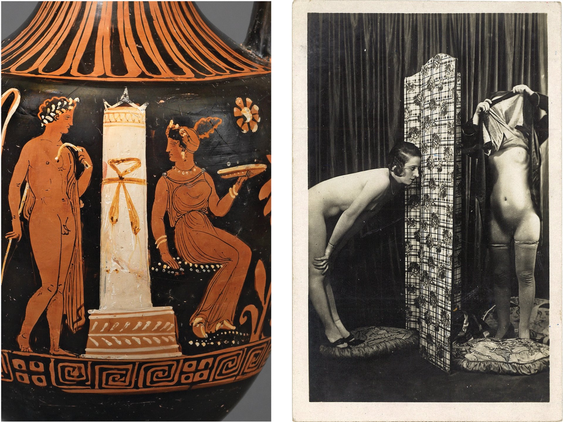 Apulian red-figure amphora, paired with a vintage postcard of an erotic female peepshow. Rupert Wace Ancient Art and John Kasmin Rupert Wace Ancient Art and John Kasmin