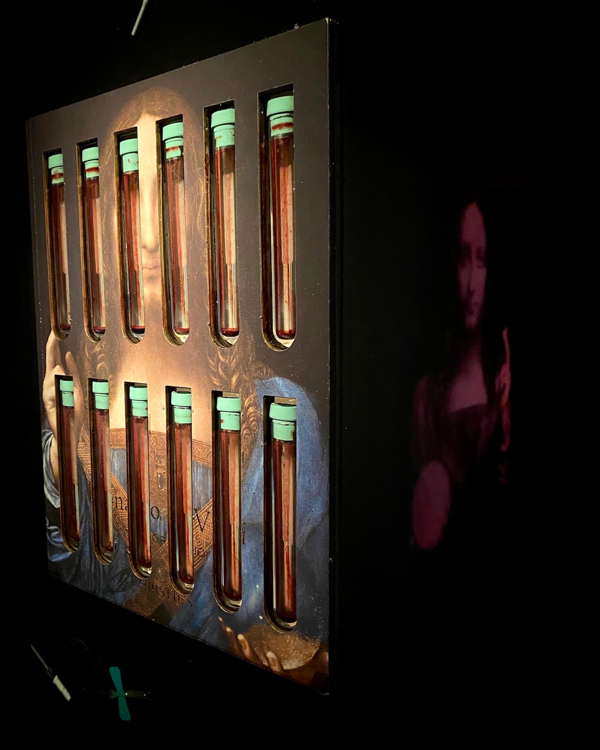 And the Queens-based artist Jordan Eagles and curator Theodore Kerr of the artist collective What Would an HIV Doula Do? have produced an installation titled Vinci that appropriates a series of images of the Salvator Mundi, the painting of Jesus Christ attributed to Leonardo da Vinci that sold for a record $450m at Christie’s New York in 2017. The artist has covered an image of the work with a layer of blood from an undetectable HIV-positive person and projected the image onto a wall; on a separate wall, the original Christie’s catalogue has been laser-cut to hold the viles used to collect the blood. The work “raises questions around authenticity and detectability”, the artist says. “It also considers that a person who is undetectable today—years after the AIDS epidemic started—is experiencing a miracle because of medicine; there’s also the irony of spending half a billion dollars on a painting of Christ rather than using it to alleviate the sick, as Jesus would have wanted.”