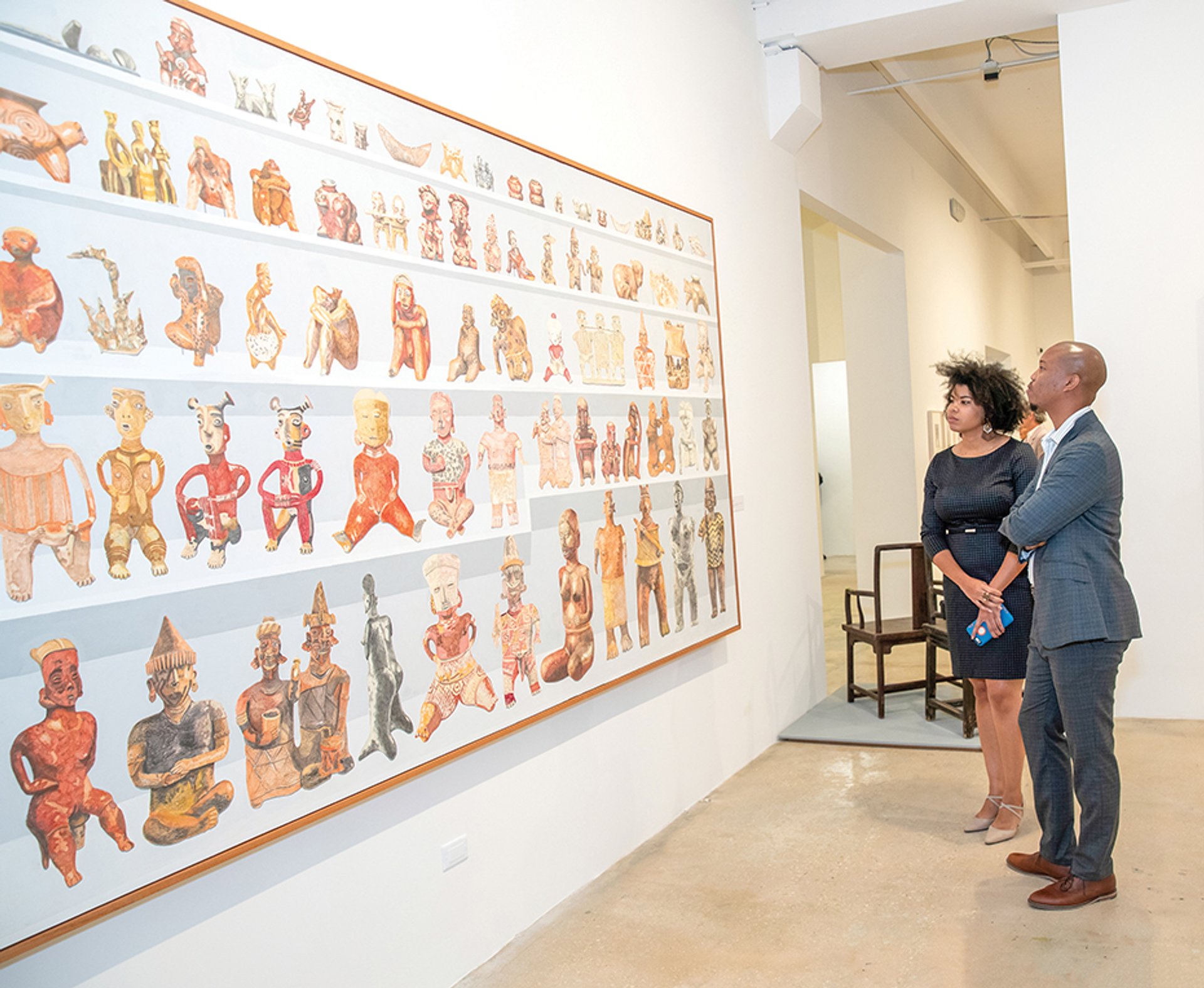 Visitors admire Gala Porras-Kim's 78 west Mexico ceramics From the Lacma collection: Nayarit Index (2017) at the newly opened El Espacio 23, which houses the collection of Jorge Pérez © 2018 Gary Mamay