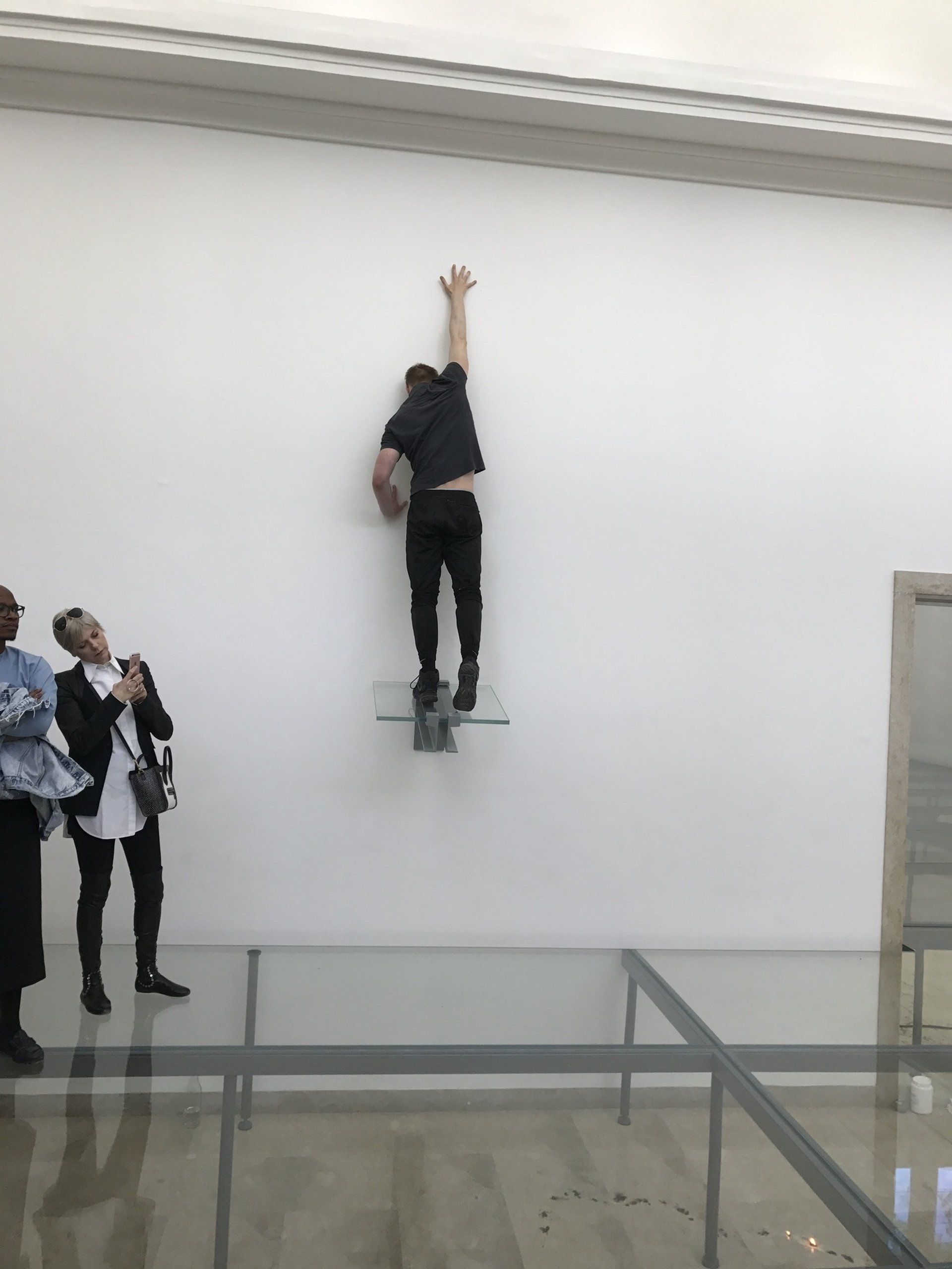 The German pavilion is peopled by young, androgynous individuals who chant, writhe and meld together above and below a raised glass floor. “Post-gender, individualised, peculiar and yet stereotypical: such are the human figures in Imhof’s paintings and scenarios,” according to the Biennale catalogue. The sense of foreboding is heightened by a penetrating background audio piece and four excitable caged Doberman dogs guarding the front of the pavilion in the Giardini. The pavilion’s curator, Susanne Pfeffer, the director of the Fridericianum in Kassel, says that Imhof confronts the “rapid and fundamental political, social, economic, pharmaceutical and technological changes that we are currently facing with a hard realism”.