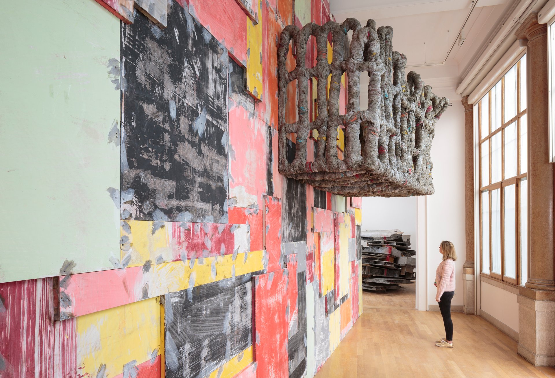 The key to Bradford’s long-awaited Biennale exhibition in is a poem written by the artist, which is set in stone on the exterior of the neo-classical US pavilion in the Giardini. It takes as its subject Hephaestus, god of the forge and of artists, who was born lame and expelled from Mount Olympus. “This poem is an interpretive key [to Bradford’s presentation]. It’s about being cast out,” says the pavilion's co-curator, Christopher Bedford, the director of the Baltimore Museum of Art. Works on show include Spoiled Foot, a bulbous mass made from lumber and luan sheeting, and a series of undulating works made from wave endpapers that wrap around the central space (Saturn Returns, 2013-17).
