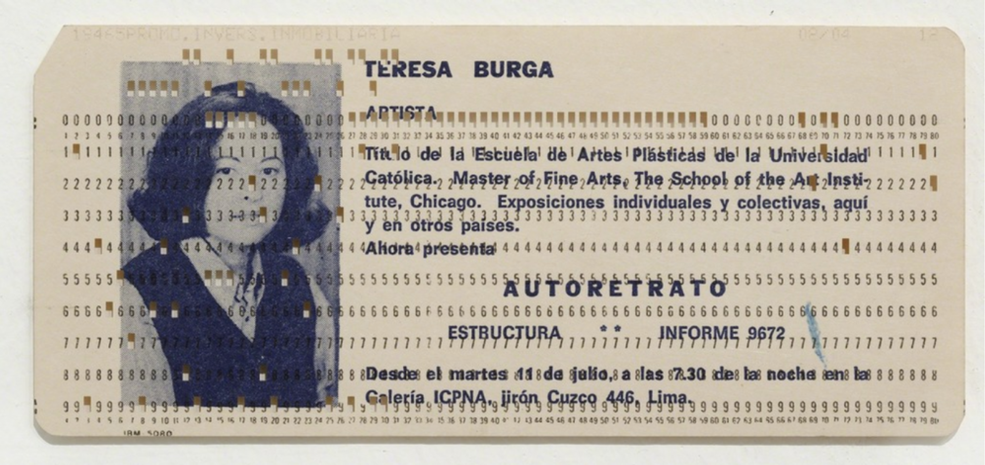Teresa Burga, Autorretrato (Self-portrait), 1972, silkscreen on a Hollerith card © Teresa Burga/Artists Rights Society (ARS), New York. Courtesy Alexander Gray Associates, New York, and Galerie Barbara Thumm, Berlin