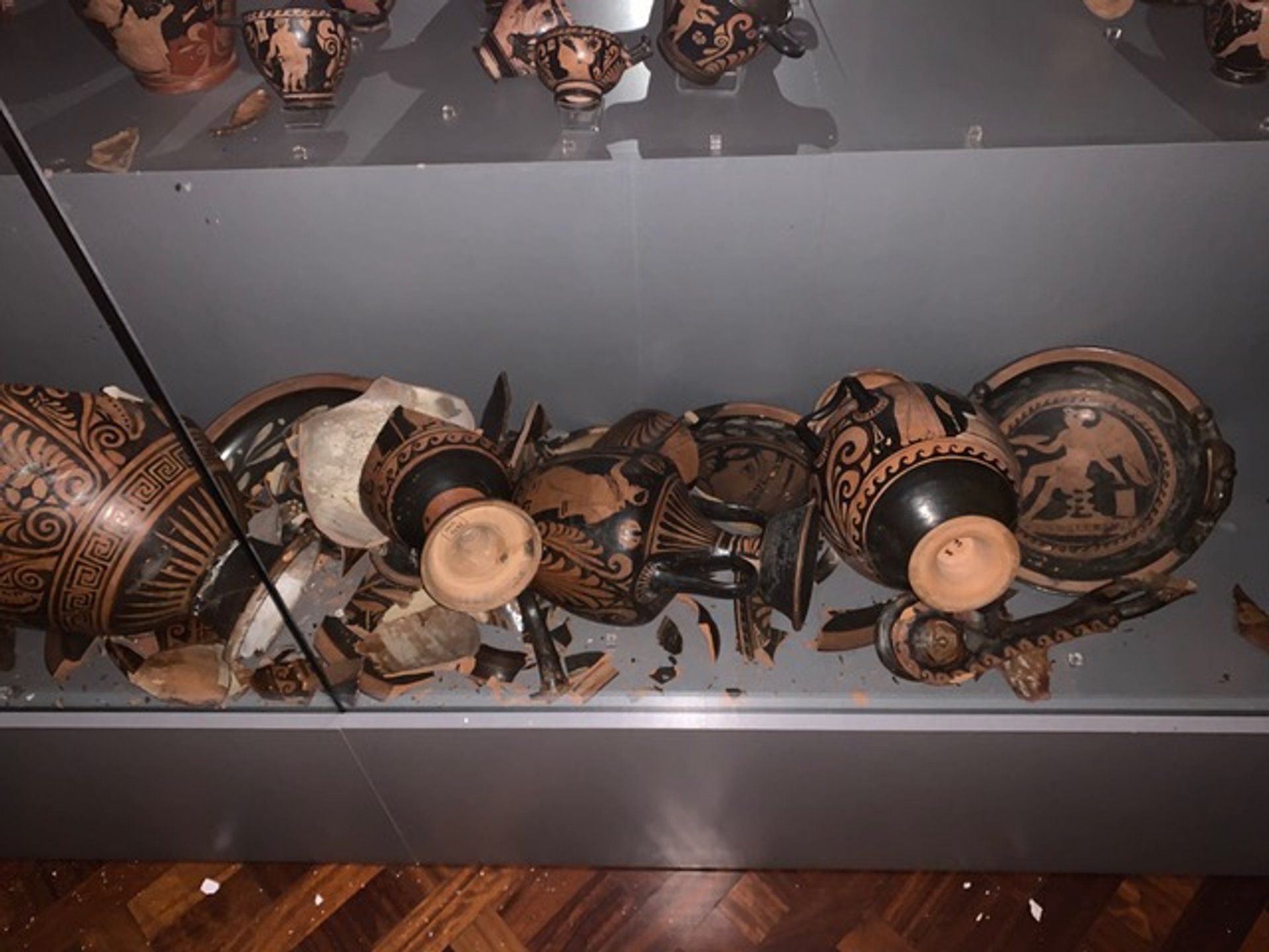 Ancient Greek ceramics in the Archaeological Museum after the earthquake