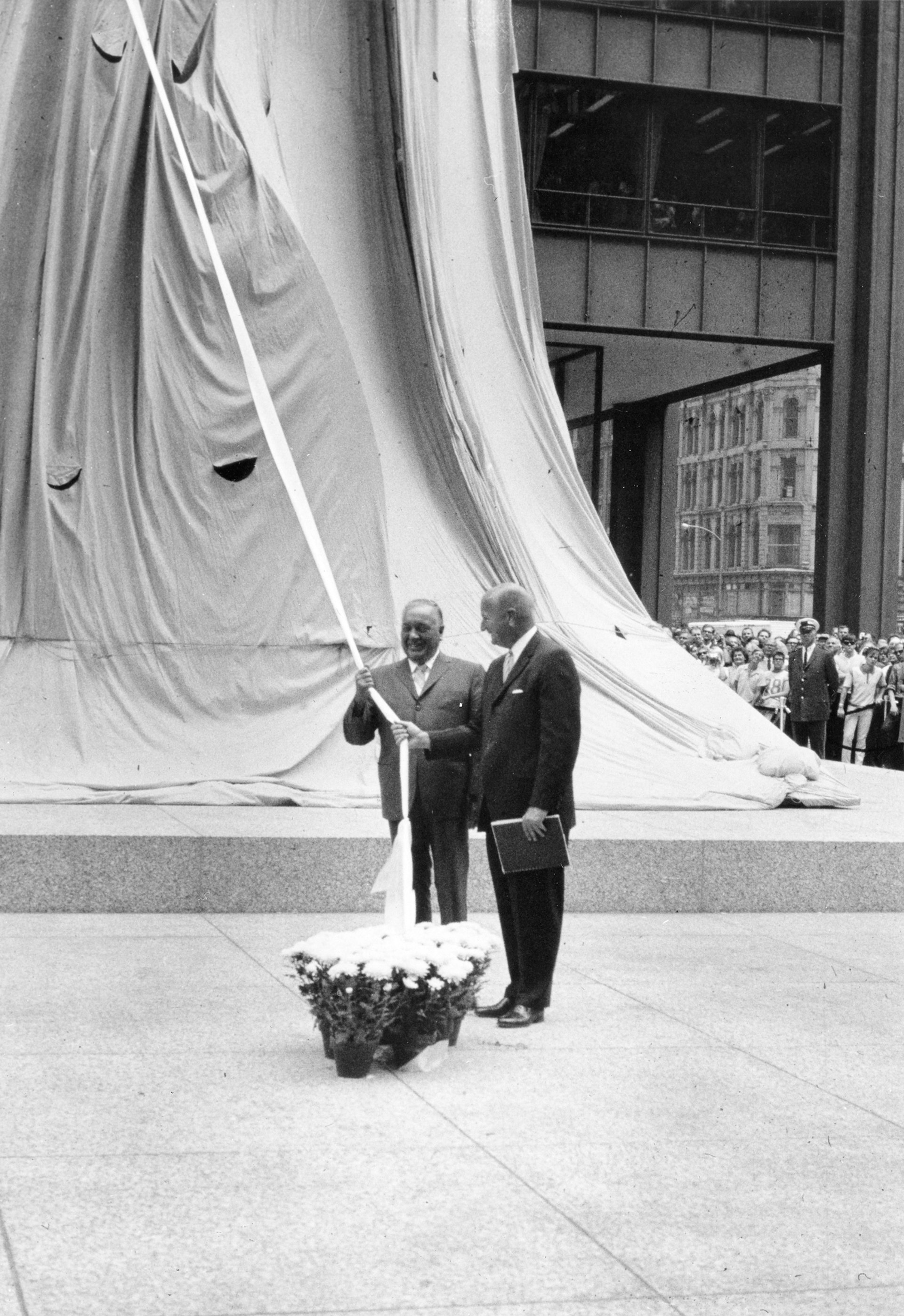 Paul Durica, a public historian who produces re-enactments and walking tours through his Pocket Guide to Hell series, approached the city with the idea of restaging the dedication ceremony a couple of years ago. Durica was intrigued not only by the scale of the 1967 unveiling—Mayor Richard J. Daley pulled a cord to release the drapery covering the sculpture, the Chicago Symphony Orchestra played, Gwendolyn Brooks read a poem written for the occasion—but with the opportunity to help the public see the work anew. “After half a century, the Chicago Picasso has become part of the built environment,” Durica says. Yet, as is well documented, the Picasso angered and perplexed some politicos and members of the public, either because of its abstraction or because of the artist’s leftist politics.