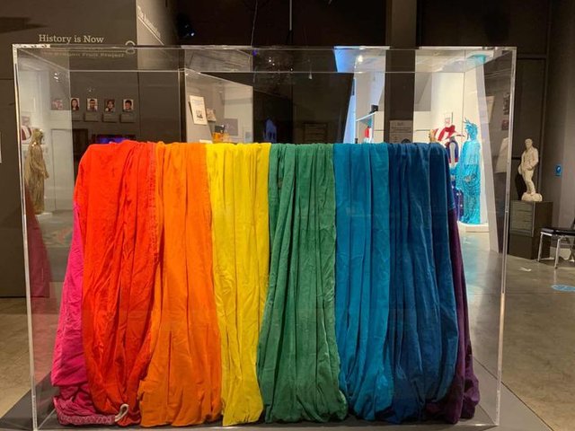 The GLBT Historical Society Museum in San Francisco traces the history of the rainbow flag and its creator in the show Performance, Protest and Politics: the Art of Gilbert Baker. The rainbow flag has now become such a ubiquitous symbol of the LGBTQ community but was only conceived as such in the late 1970s, when the late Kansas-born artist and activist Gilbert Baker created a colossal eight-colour rainbow flag for the San Francisco Gay Freedom Day Parade. Although the flag existed before a symbol of peace, among other things, Baker’s iteration, which he hand-dyed and stitched with strips of muslin, assigned each of the eight colours a different meaning, such as green for nature, yellow for the sun and pink for sex. The original flags for the parade were lost, but a widely adopted symbol was born. The flag was acquired by the Museum of Modern Art in New York in 2015. In an interview with the museum, Baker says that flags are a proclamation of power, and that he wanted to create something that represented the gay community as a “people and a tribe”.