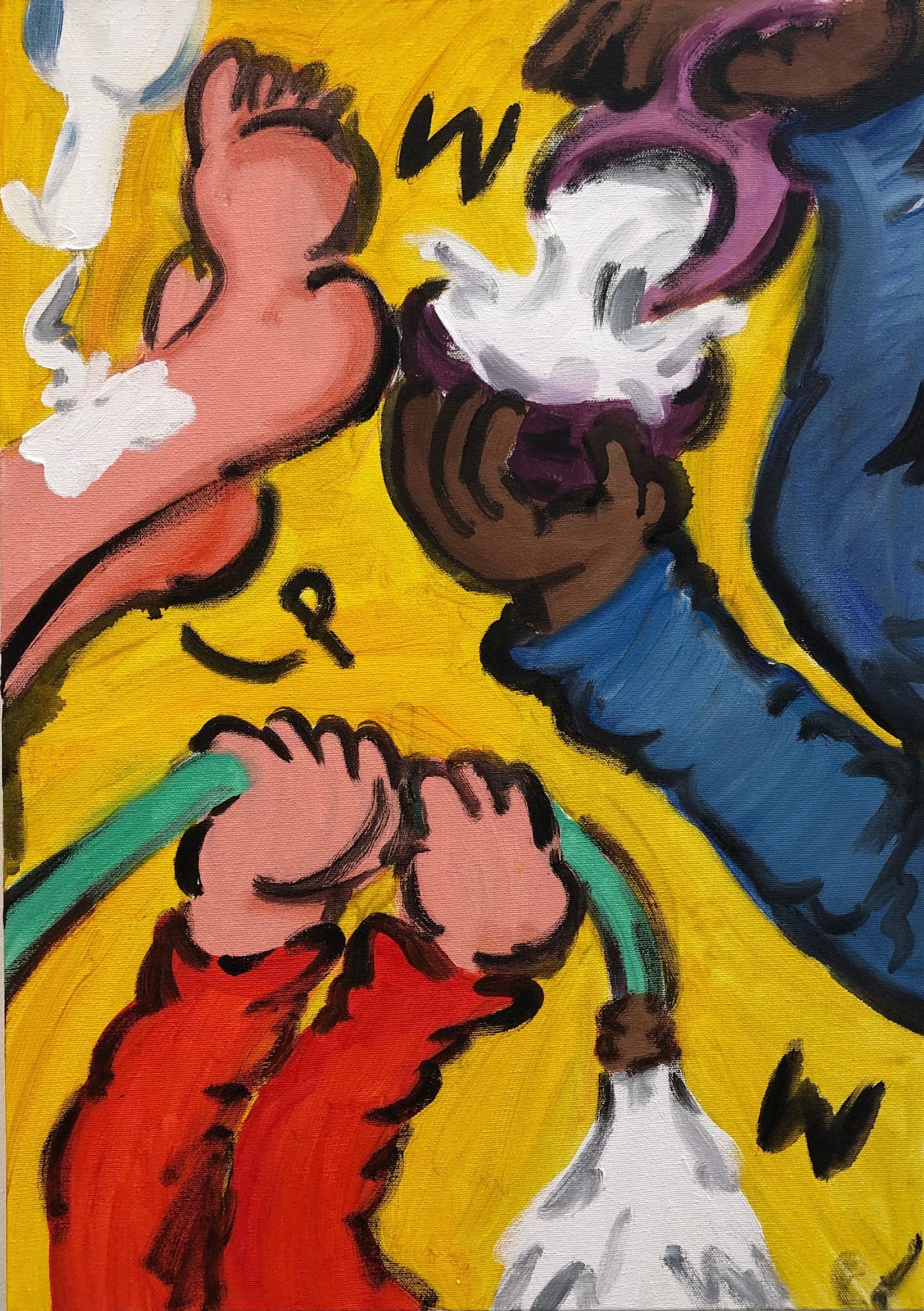 Two are from her Double Cream series from 2019. The works are, Sterling explains, “a reaction to skin whitening, tanning and wanting to be a specific colour shade, this exotic beauty ideal”. She draws parallels with British deserts—“how you’ll have spicy puddings that you will put double cream on to lessen it”, she says. The pervasive “white gooeyness” of the cream becomes a symbol of “how white supremacy is a part of our everyday lives, we can especially see that now”.
