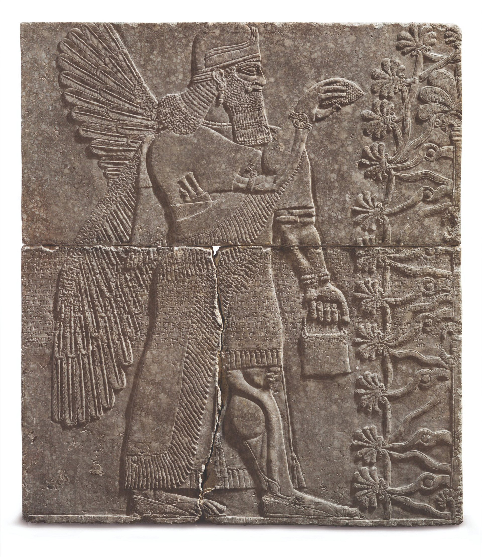 The pair of reliefs, depicting winged protective deities, were set in the walls of the palace of Ashurnasirpal II at Nimrud, in present-day northern Iraq. Nearly one metre high, they are carved from gypsum alabaster.