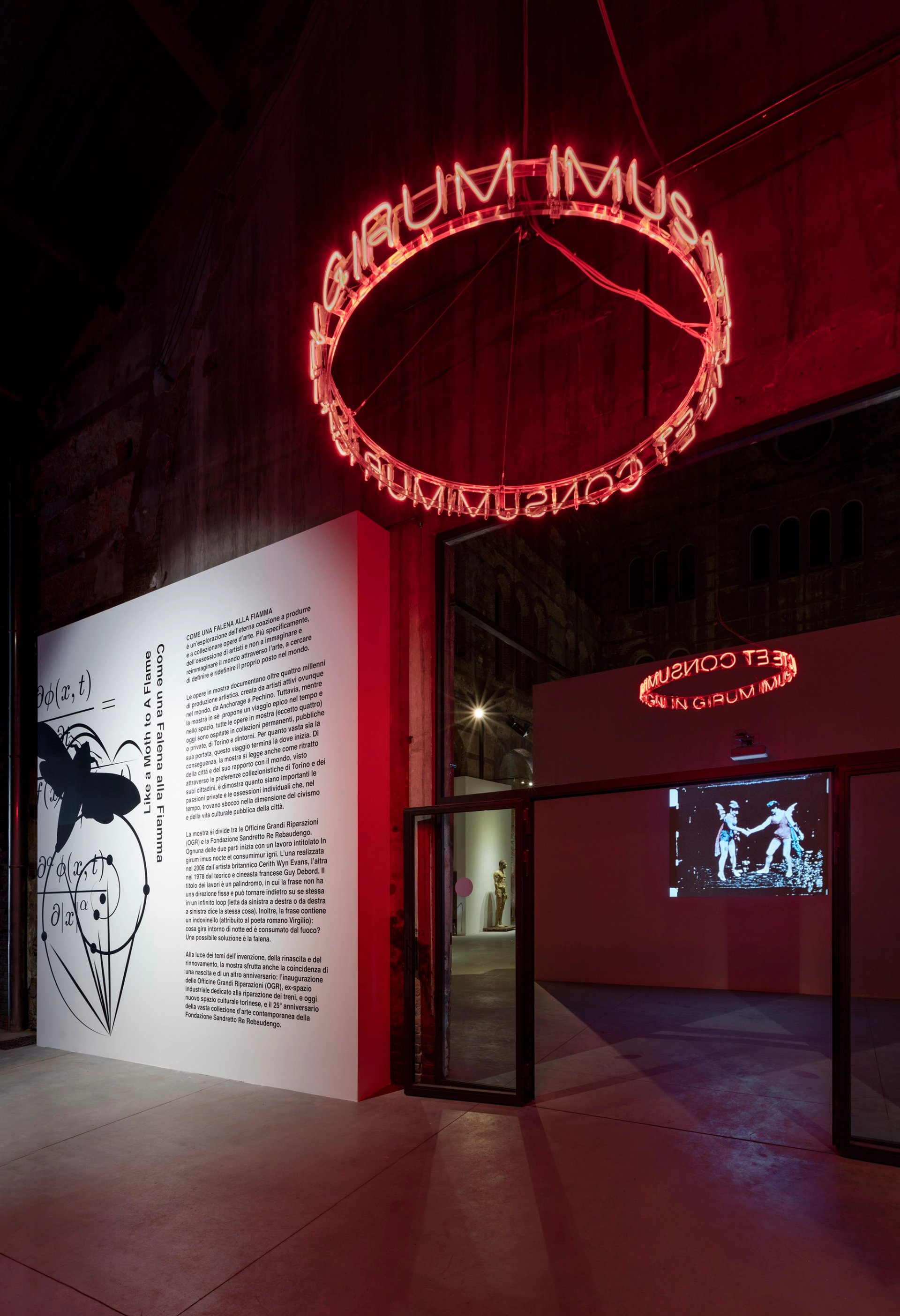 The title of the exhibition, a comment on the urge to collect, is taken from a circular neon work by Cerith Wyn Evans, In girum imus nocte et consumimur igni (2006), hanging above the entrance to the OGR show. The answer to the riddle it posits (what “goes around at night and is consumed by flames?”) is presumed to be a moth.