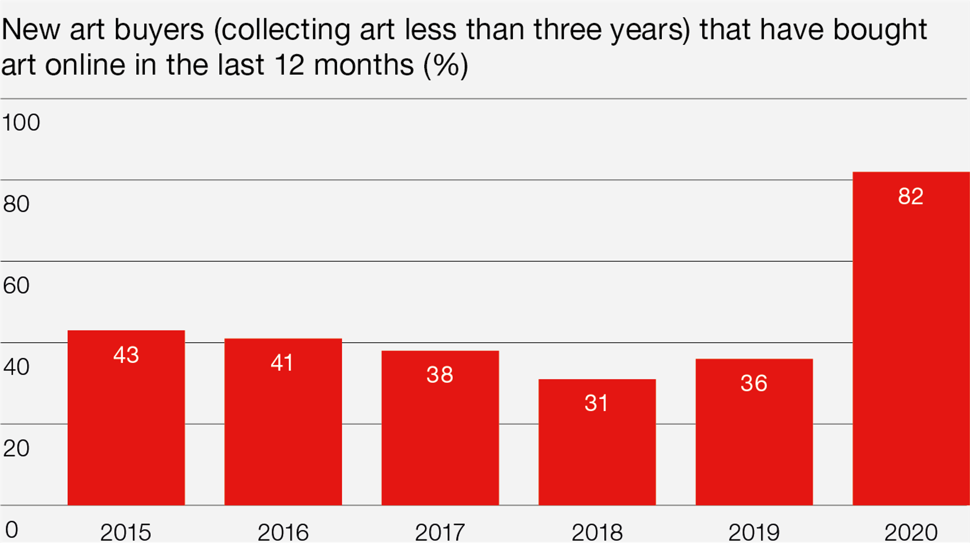 However these much desired fresh digital collectors are a fickle bunch when buying online—according to the report, nearly half (47%) of new art buyers said they "never" or "rarely" felt any loyalty towards the online platforms they bought from, up from 40% in 2019.