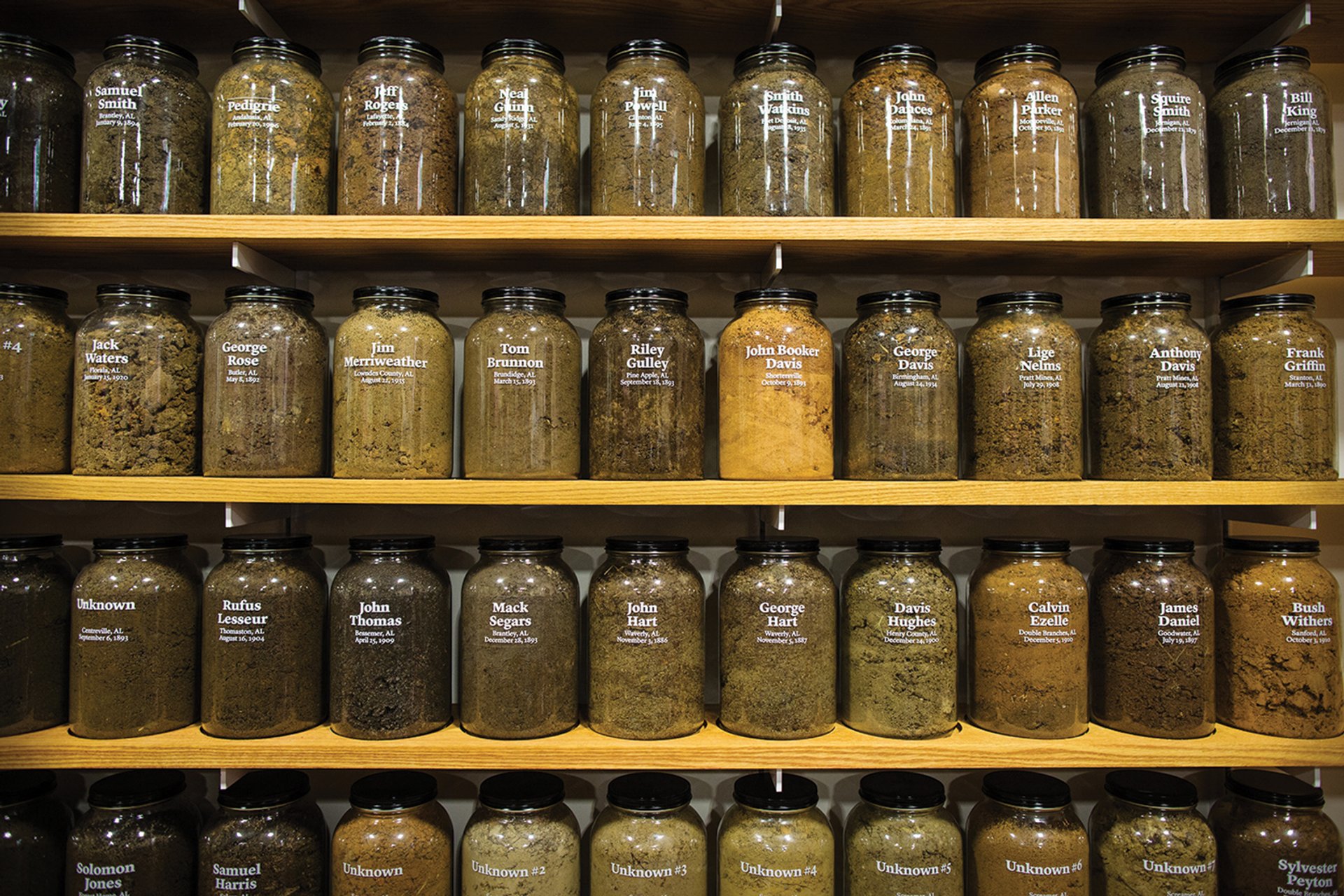 Another of the museum’s displays is a collection of jars holding soil from lynching sites. Norman helped to collect some dirt from under a tree outside Selma. “We had to uproot so much that has gone down in our history, to unearth the living legacy of someone. It was amazing,” she says. “It was kind of an overcast day. We had just filled the last jar with dirt. Before we could cap them, all of a sudden, the clouds began to part. We just cried.”