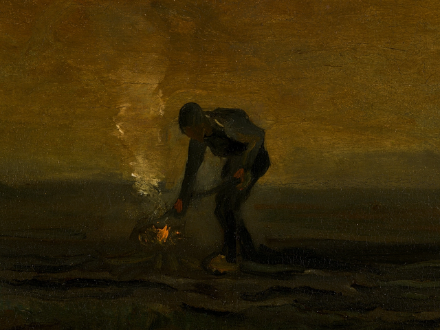 Peasant burning Weeds can be dated from one of Vincent’s letters, which included a small sketch of the picture. On 22 October 1883 he wrote to his brother Theo: “I’m still working on that weed burner, whom I’ve caught better than before in a painted study as far as the tone is concerned, so that it conveys more of the vastness of the plain and the gathering dusk, and the small fire with the wisp of smoke is the only point of light.” At this stage he had only been painting in oils for just under two years.
