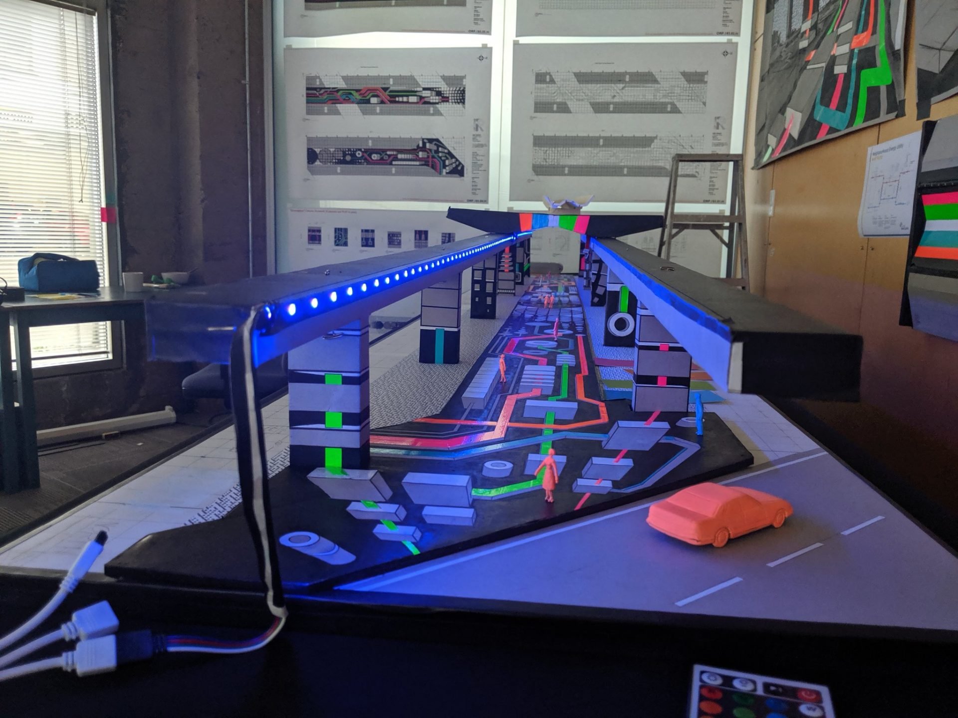 Exploring how “how public space can be constructed and utilised in both digital and physical realities”, the work will be both a physical work of art and a digital one. A vinyl overlay installed directly on the underside of the bridge deck, extending around the columns and down to the ground, will make the structure look like a slightly skewed circuit board. A kind of optical illusion, viewers may feel as if they are floating off the sidewalk or are literally part of the city grid. The work’s title is based on the name for a single point in three-dimensional computer graphics, similar to how a two-dimensional point is called a pixel.