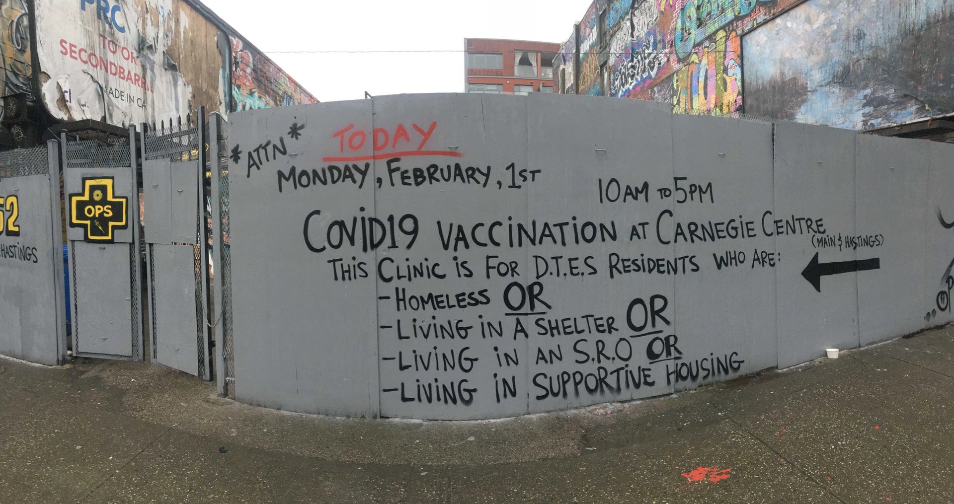 Framed by a wall of graffiti, a cracked billboard by local billionaire Jim Pattison’s signage company and social housing, the mural could have become a new landmark. But after one of the artists involved, Trey Helten, says he was warned by city officials that it was “illegal to make a mural that is directly targeted at an individual,” it was soon covered up by more urgent graffiti: reminders about Covid-19 vaccinations.