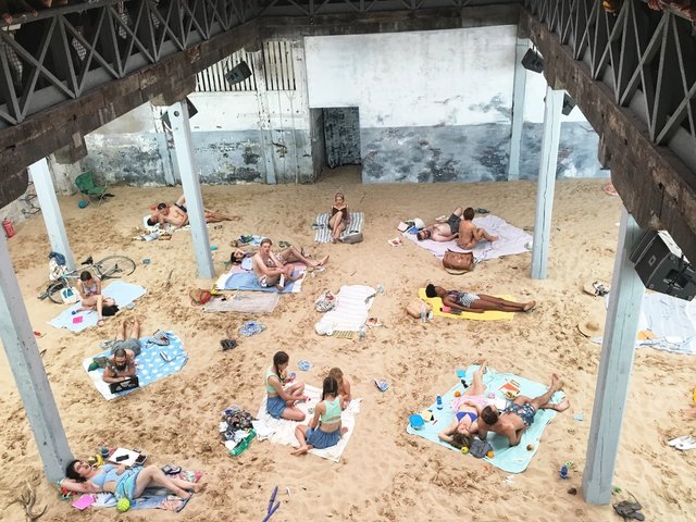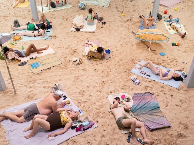 The work consists of an “opera-performance” performed by day-trippers sprawled across a beach; the piece seems frothy but becomes darker with a barbed message for humanity, warning of the consequences of climate change. In Venice, audience members became voyeurs, gazing down from balconies at the sandy stage set in the Arsenale, where performers dressed in bathing suits and surrounded by seaside paraphernalia (lunch boxes, Sudoku, colouring books) casually sprawled on their towels and sun loungers.
