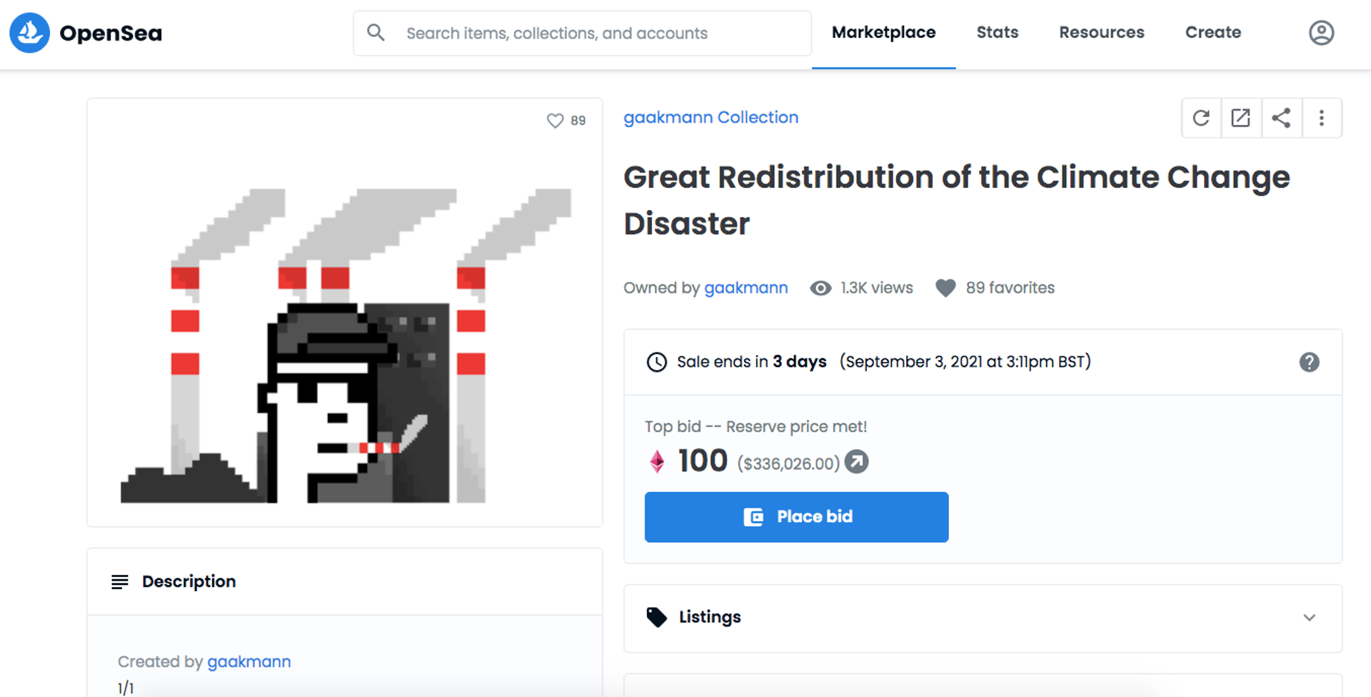 Titled Great Redistribution of the Climate Change Disaster, the NFT—an 8-bit style image of a CryptoPunk figure smoking a cigarette in front of four factory chimney stacks emitting plumes of smoke—seemed to be a comment on the climate crisis, a topic Banksy has been vocal about in the past.