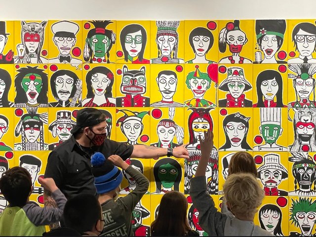 While Bandura conceived of the paintings as individual portraits at first, he soon realised that they comprised a whole, forming a single, large, and very powerful mural. Bandura says he thought about his own young children as he painted the works, all set against a yellow backdrop with features etched in black and white, punctuated by vivid reds and greens. “I wanted them to be simple images that could be easily absorbed together,” Bandura says. “Instead of adding a lot of shading and depth to the faces, I wanted each of their individual qualities to be obvious.”