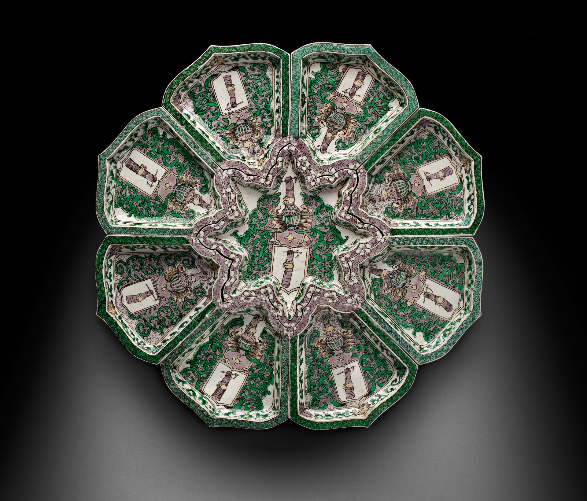 Craftsmen in Europe and the Americas responded to the influx of Asian goods by creating pieces that imitated them. Delftware, the white glazed Dutch alternative to Chinese porcelain, became an export product of its own. “Although it was made in Delft, it was seen as something that fit into this exotic world of Asian imports,” Van Campen says. In the Americas, blue-and-white majolica was a popular substitute for Chinese porcelain.
