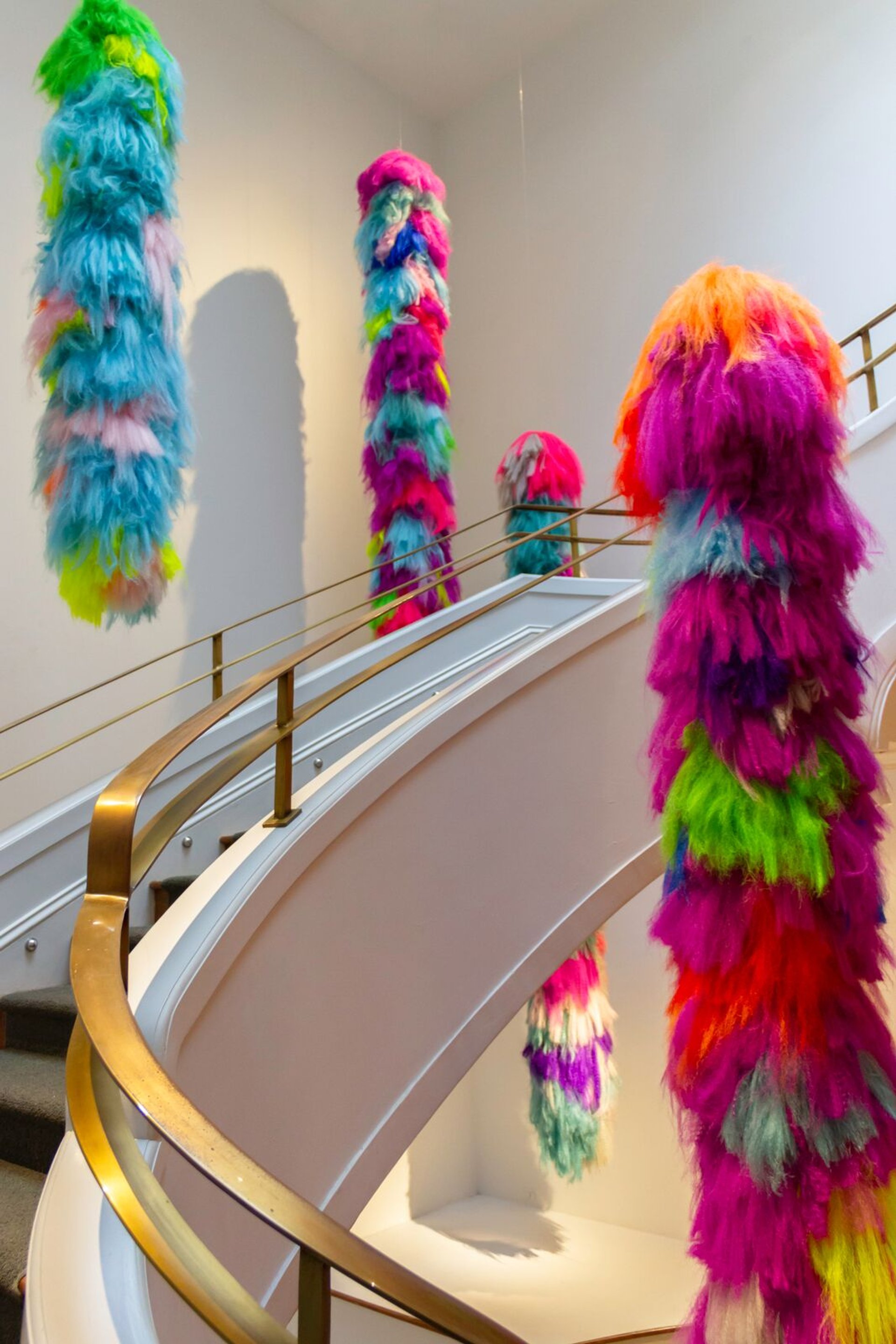 Her colourful work at the Phillips, Nervelings I-V (2018), is made of synthetic fiber and rope and is installed over the main museum staircase. Although she is impressed by her native country’s gender equality, Arnardóttir says, she moved to New York craving more diversity. “I still knew that my DNA is so much in Iceland, and there’s no chance of it getting polluted by any other experience,” she said at the press viewing. “I get more head space in New York than in Iceland.”