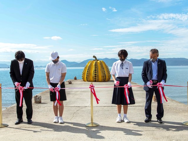 The sculpture was installed in 1994. According to a Benesse exhibition catalogue, “the work was one of the largest pumpkins Kusama had made up to that point, and it was also her first sculpture created with an initial intention to be exhibited in [the] open-air… Kusama’s Pumpkin painted in yellow with black dots continuously changes the everyday landscape into something new.”