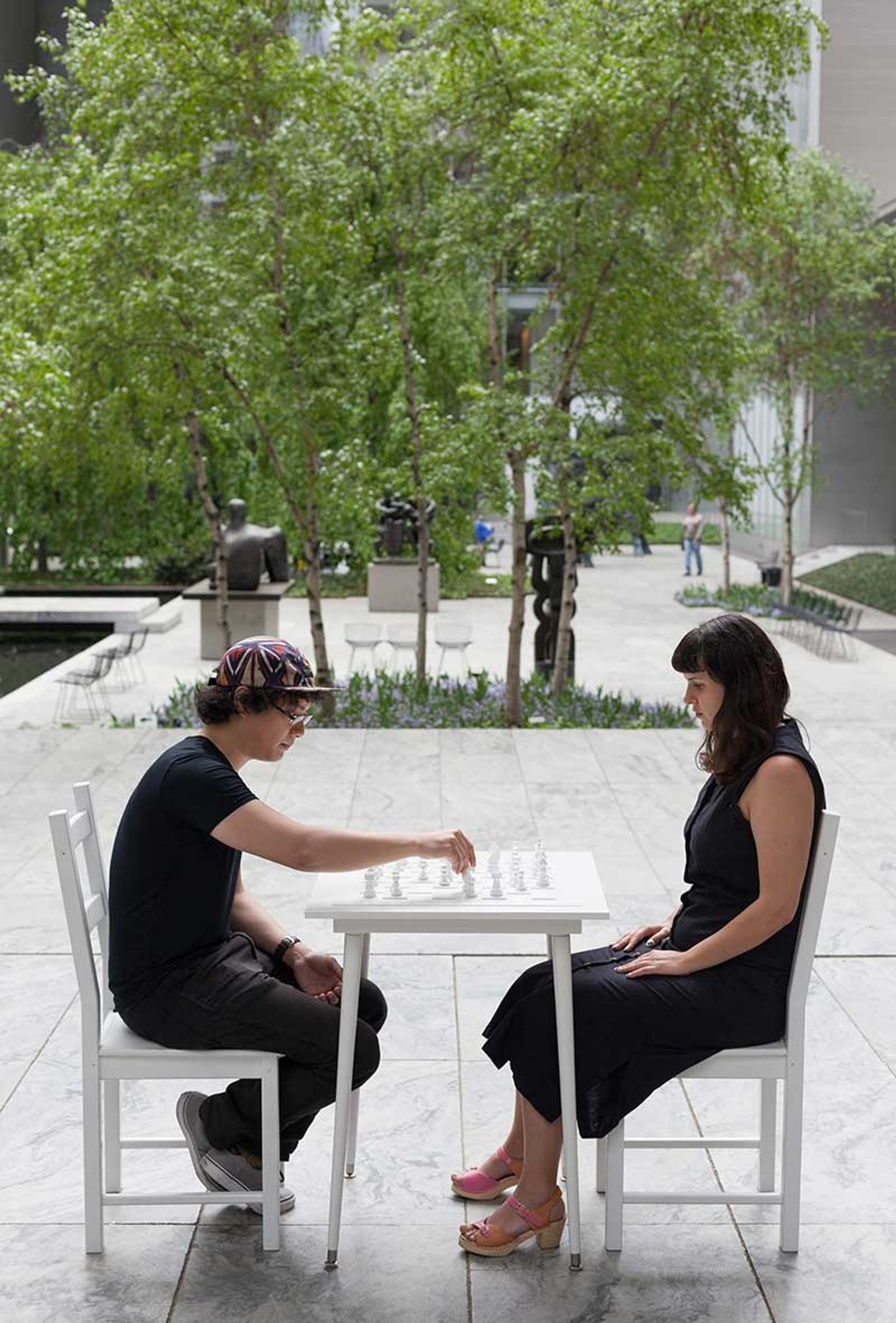 The “job of an artist,” Ono maintained, was not to make things, but to communicate. “Artists must not create more objects,” she wrote in 1971, “the world is full of everything it needs. I’m bored with artists who make big lumps of sculpture and occupy a big space with them and think they have done something creative.” For an artist who maligned object-making and excelled in language and film-ready performance, it comes as no surprise that her sculptures are the weakest works in the MoMA exhibition. The show opens on the lame one-liner of Apple (1966), a readymade assemblage consisting of a granny smith resting on a Plexiglas pedestal. The exhibition’s self-styled piece de resistance is the crowd-baiting interactive installation To See the Sky (2015), a spiral staircase leading to a skylight in the gallery’s ceiling. The only new work commissioned for the show, it lacks the experiential payoff to justify the long lines. The relative poverty of Ono’s sculpture is exacerbated by conservative curating. Several of the participatory works from Ono’s 1966 London show at Indica gallery are regrettably roped off, inviting familiar complaints about the “museum-as-mausoleum” and the “institutionalisation of the avant-garde.” A notable exception is the lapidary, conceptually elegant White Chess Set (1966), which museumgoers are allowed use during prescribed hours. A beautiful object in its own right, it invites the participants to play until they can no longer distinguish their pieces from their opponent’s (all the pieces are white), dissolving a Manichean contest into a ludic exercise of non-dualism and benign chaos.