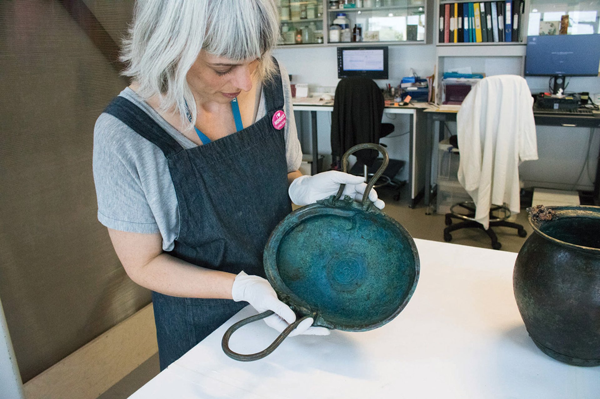 Conservator Alexandra Baldwin with the potential urinal in the Ashmolean’s lab © Ashmolean Museum
