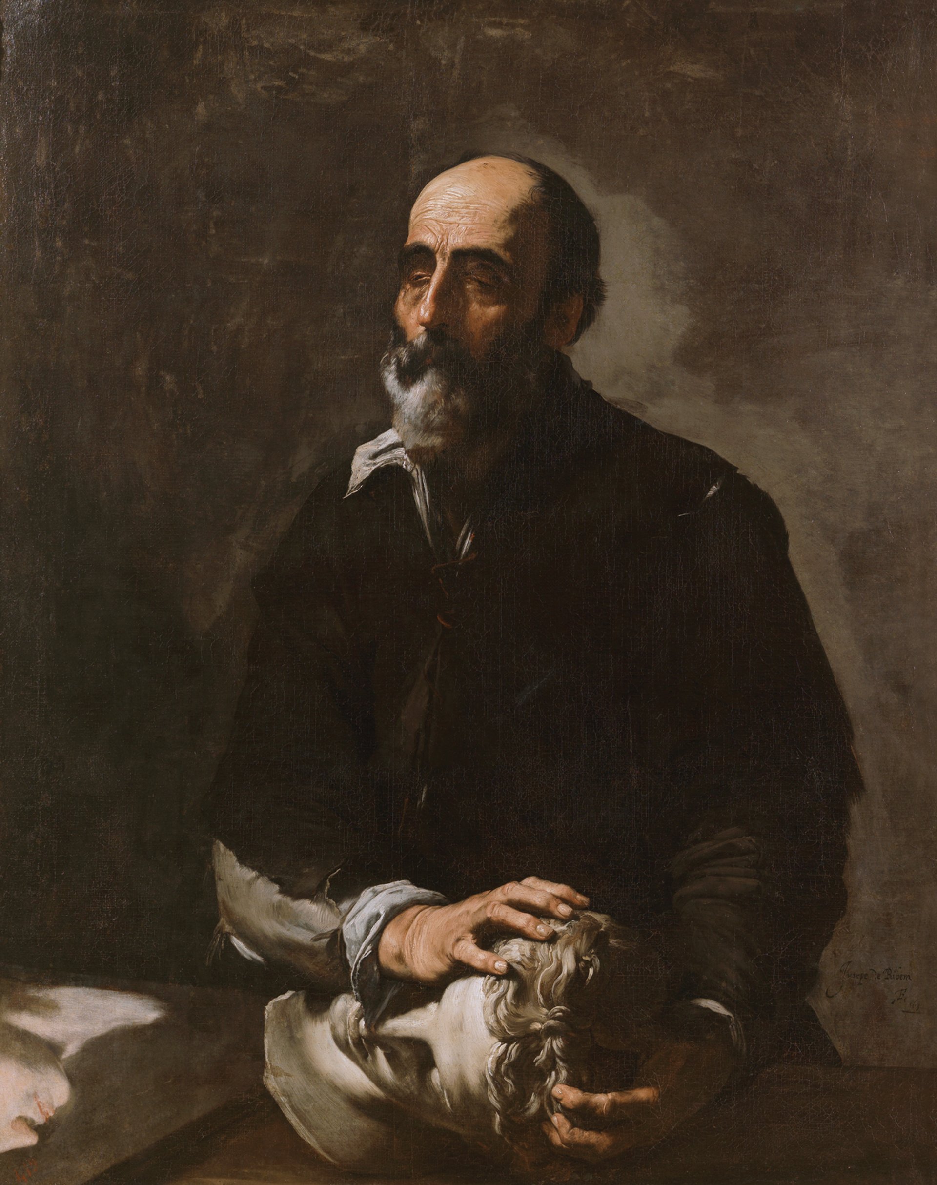 The curators have borrowed a marble head of Apollo from the British Museum and are proposing that this is the same one that Ribera painted from, which also appears in a 1628 version of the Martyrdom of Saint Bartholomew and in The Sense of Touch (1632). Unfortunately, the museum would not allow the sculpture to be displayed on its back as it appears in the paintings, Bray says.