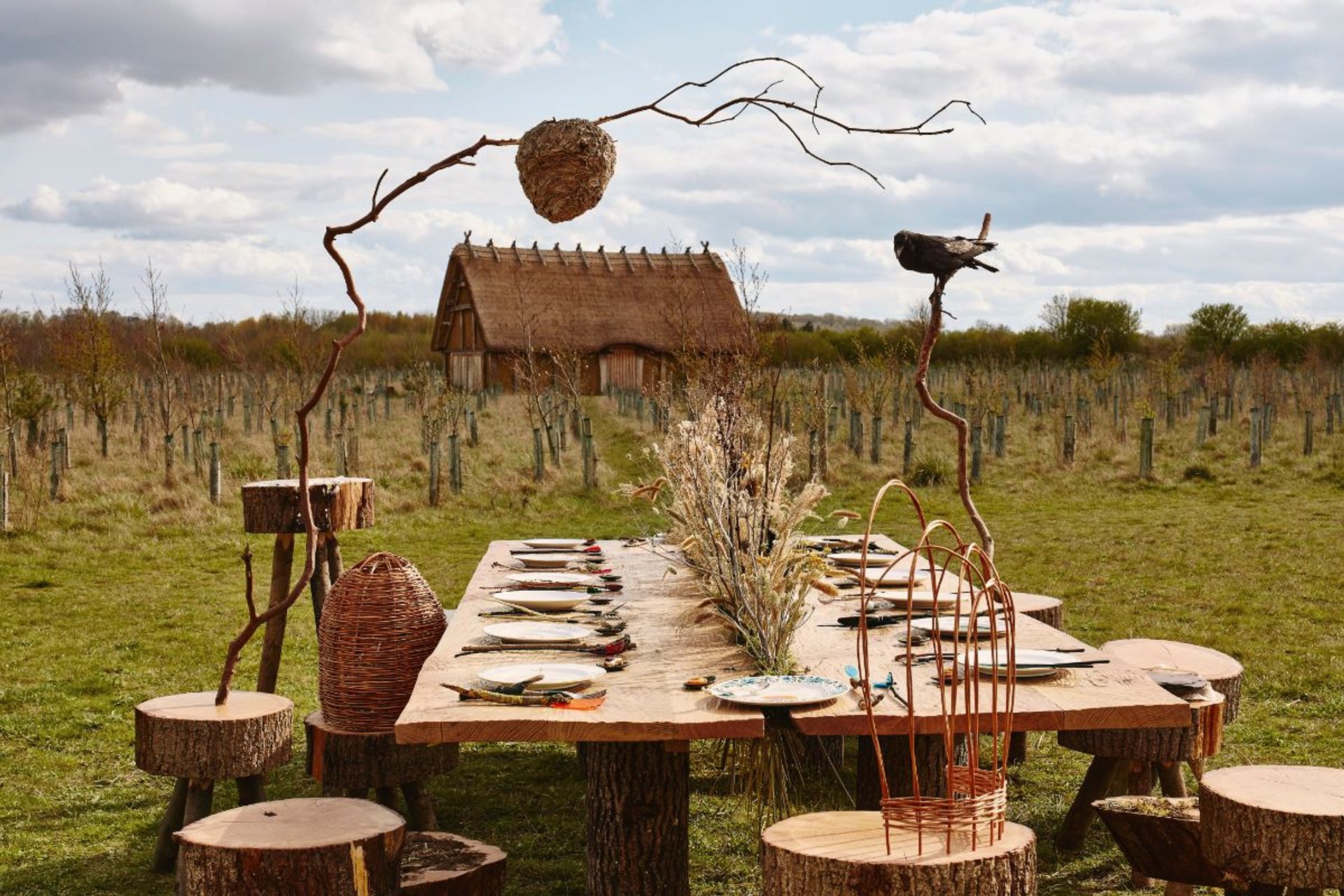 The installation is described as “a symbolic home where all species can prosper with resilience, adaptation, and hope... Around this table, three humans—man, woman and child—join a fox, rat, wasp, pigeon, cow, wild boar, snake, beaver, wolf, raven and mushroom.” The cutlery has even been adapted for the different guests (the wasp has his own spoon).