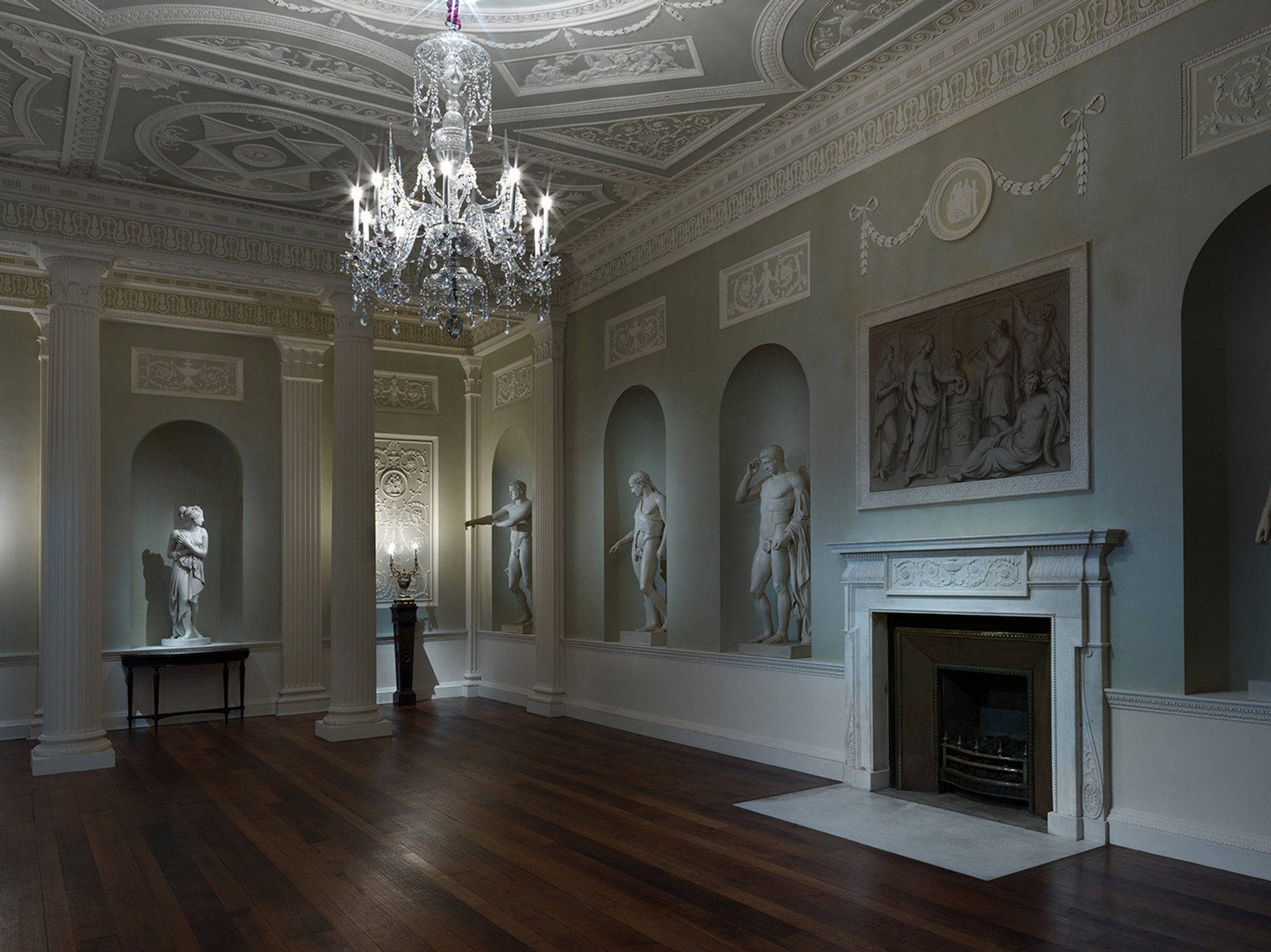 Three galleries are devoted to the re-creation of striking 18th-century British interiors moved from Kirtlington Park (Oxfordshire), Croome Court (Worcestershire) and Lansdowne House (London). A wall text notes that the Lansdowne dining room, designed by Robert Adam and crowned by an intricately decorated ceiling, banished odor-absorbing textiles that would have retained “the smell of the victuals”.