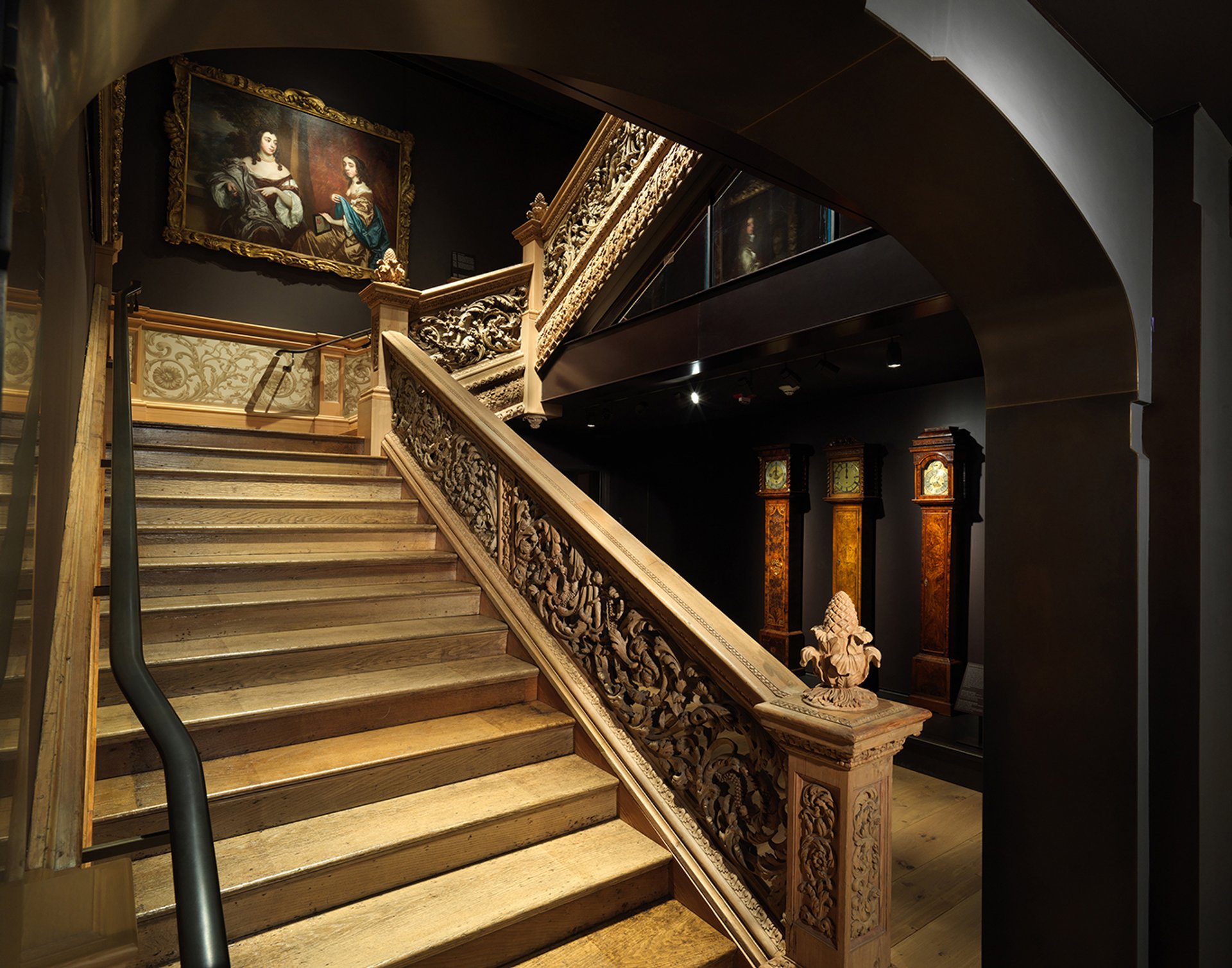 Surveying the gallery from its perch is a polychrome terra cotta bust that is thought to depict Bishop John Fisher, who was executed for opposing Henry VIII’s decision to lead the Church of England away from Roman Catholicism and papal authority. Leading to a mezzanine is another highlight, the magnificently ornamented and newly conserved pine and elm staircase from Cassiobury Park, Herfordshire (around 1677-80), with its naturalistic acanthus leaves, acorns, birds and snakes.
