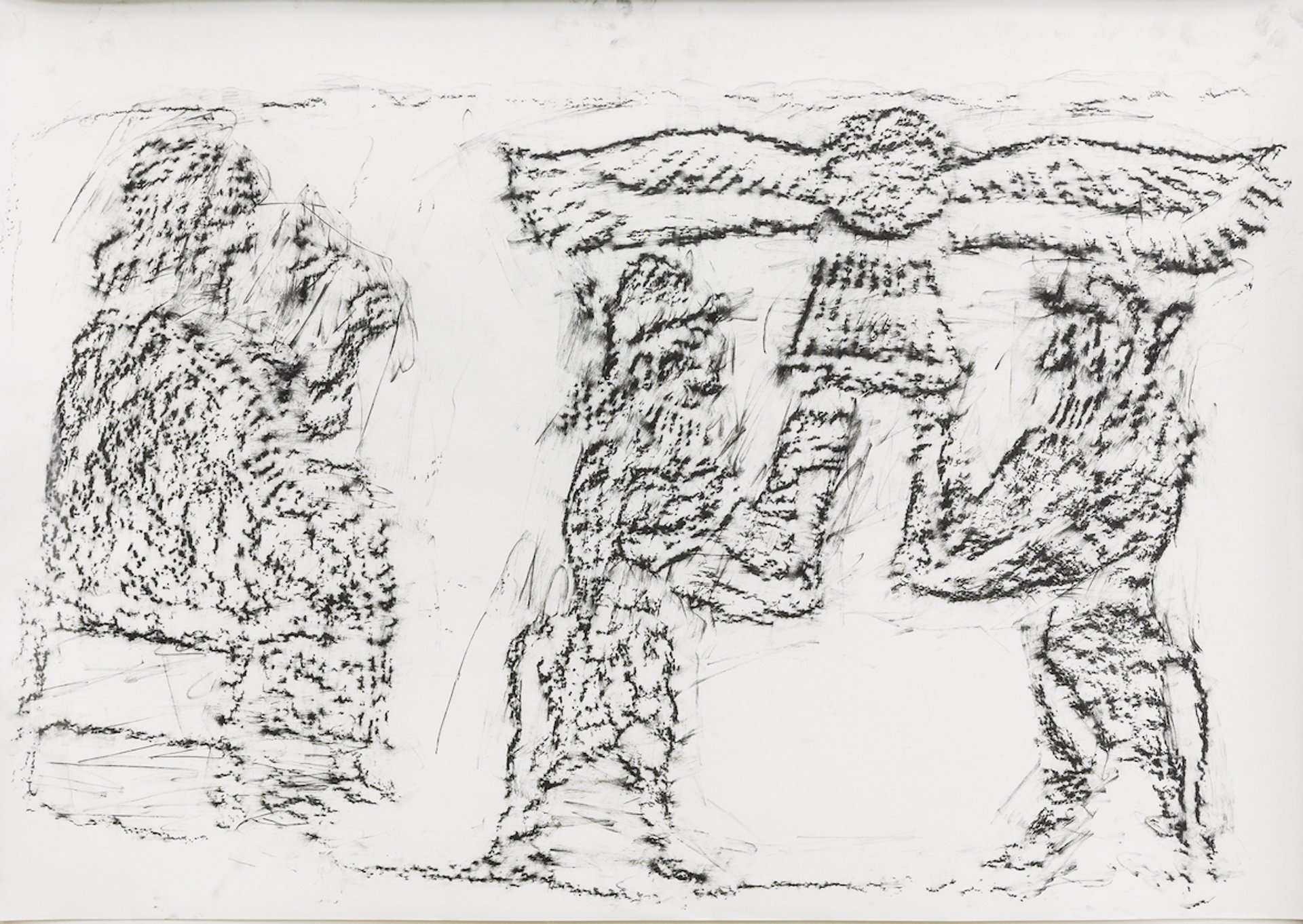 Tabet first approached the museum in 2016 to request permission to produce charcoal rubbings of four ninth-century BC stone reliefs from Tell Halaf. His goal was to conceptually “resuscitate” an extant frieze from the site that was excavated in the early 20th century by the German archaeologist Baron Max von Oppenheim. Tabet was inspired by his great-grandfather, Faek Borkhoche, who worked incognito as a translator alongside von Oppenheim in Tell Halaf while serving as an informer for the French government. Borkhoche suspected Oppenheim of using the dig as a cover-up for mapmaking activity in areas under French and British rule.
