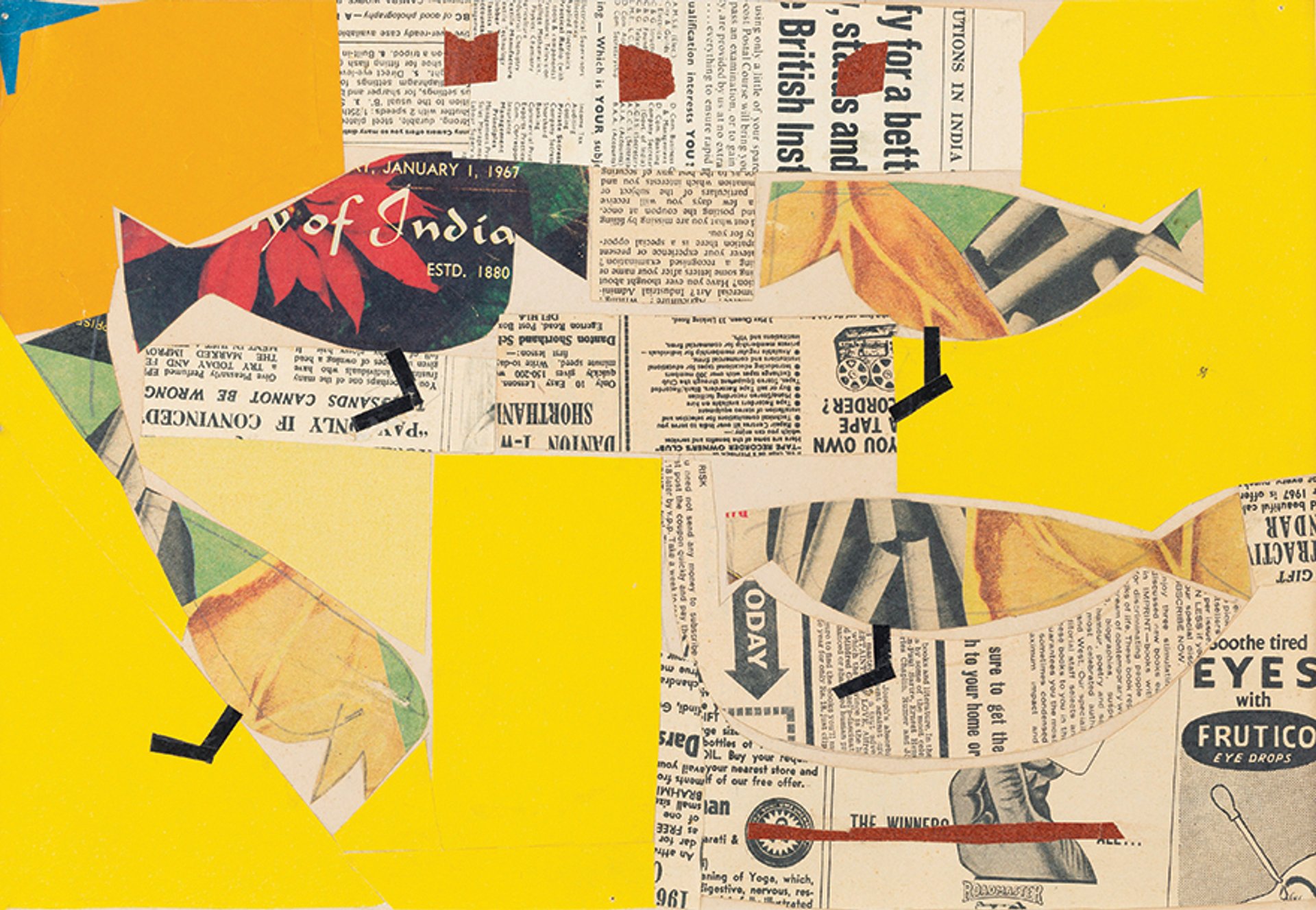 After losing his sight following a botched eye operation, the teacher and artist Benode Behari Mukherjee started making collages until his death in 1980. Among Mukherjee’s pupils at the fine arts institute of Kala Bhavana in West Bengal was film-maker Satyajit Ray, whose 1972 documentary film, The Inner Eye, includes Mukherjee’s words: “Blindness is a new feeling, a new experience, a new state of being.” This Cubism-influenced collage is one of 59 Mukherjee works consigned to Christie’s South Asian sale this month by the foundation of his daughter, the late Mrinalini Mukherjee, who was also an artist.