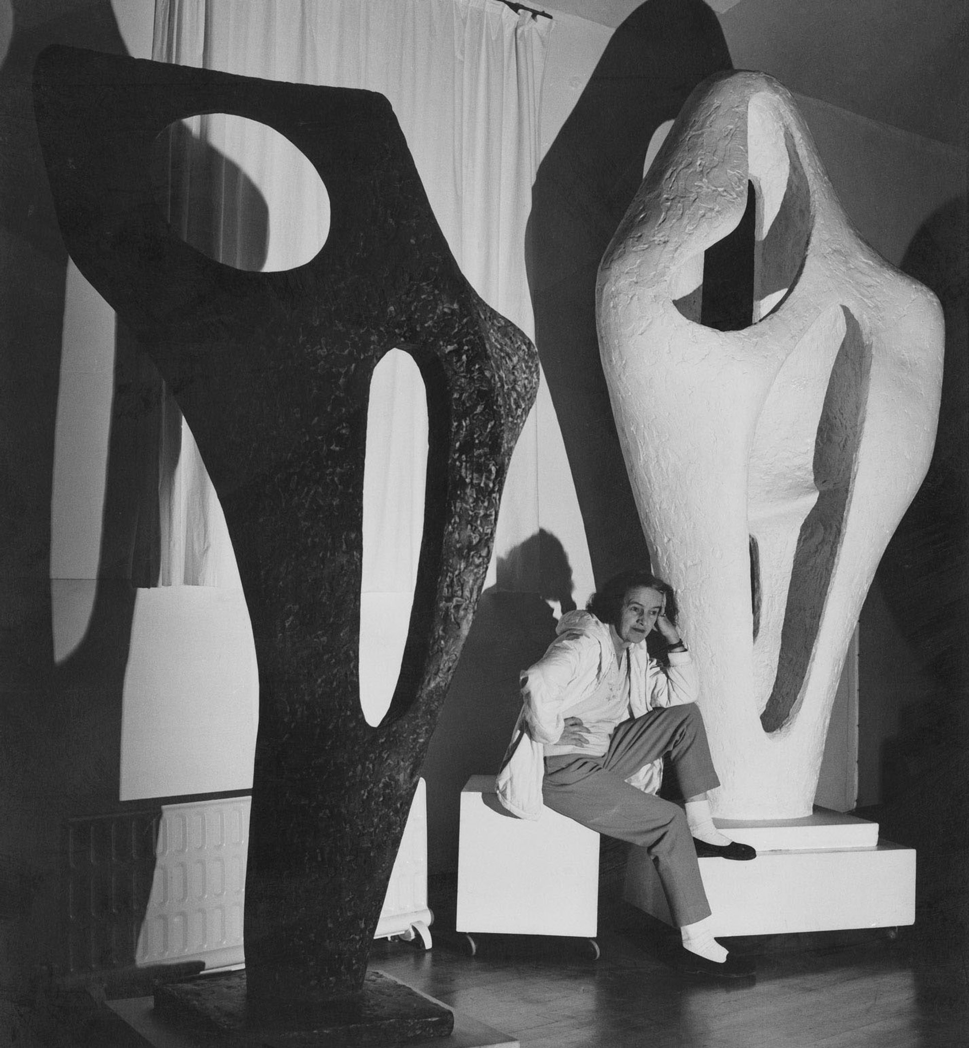 Barbara Hepworth with the Gift plaster of Figure for Landscape and a bronze cast of Figure (Archaean) in November 1964 © Bowness, Hepworth Estate. Photo: Lucien Myers